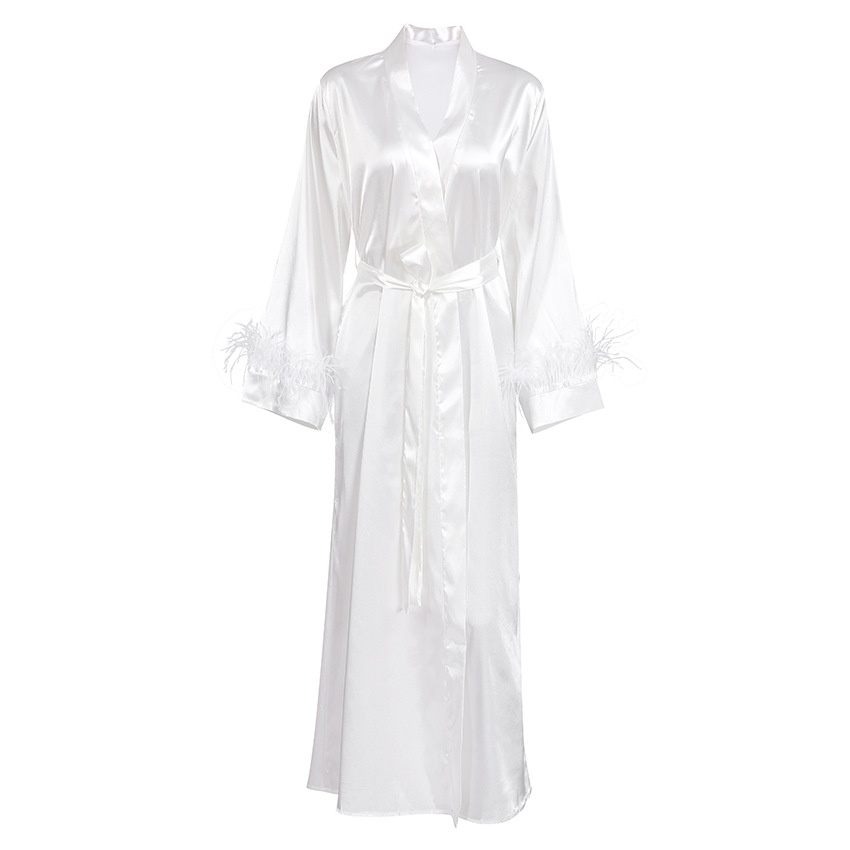 French Autumn And Winter Long-sleeved Nightgown Feather White Fashion Bow Pajamas Satin European And American Long Ladies Home Clothes