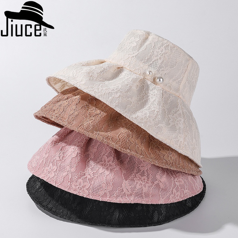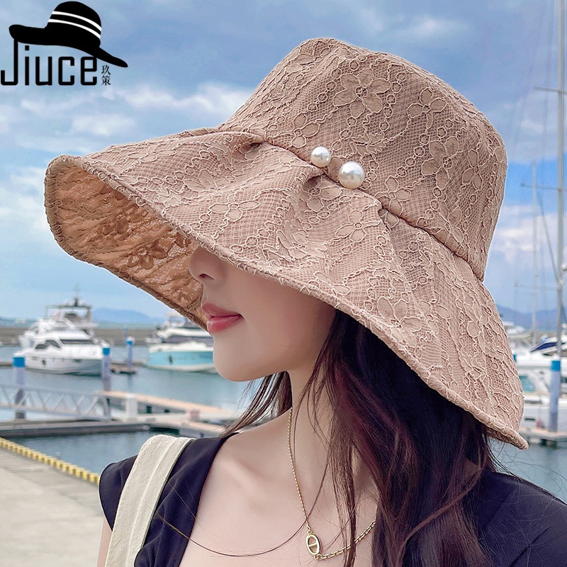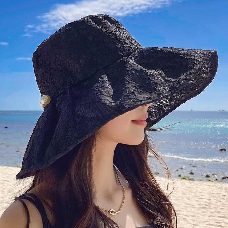 Temperament Goddess Summer Outdoor Sun Protection Wide Brim Hat Gentle Pearl Lace Foldable Sun Hat Korean Fisherman Hat