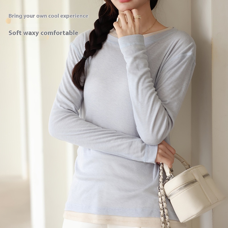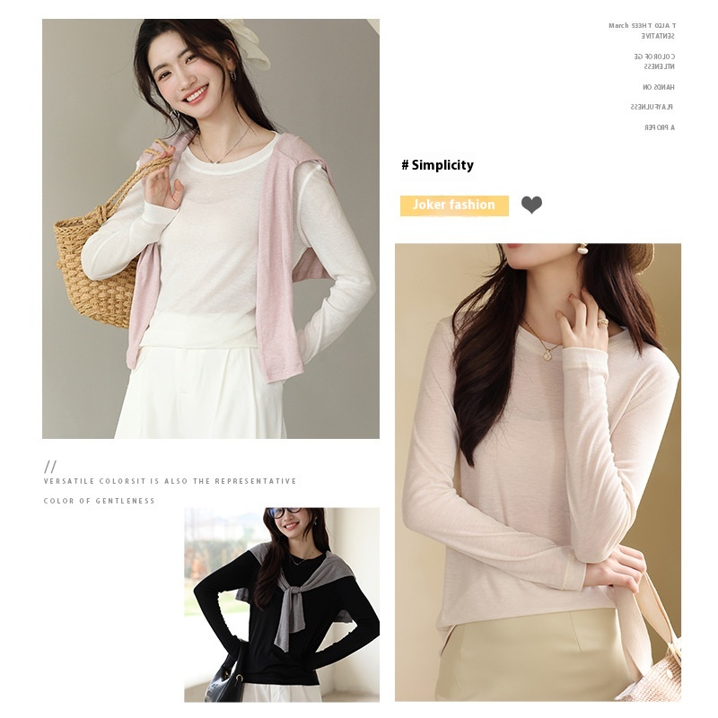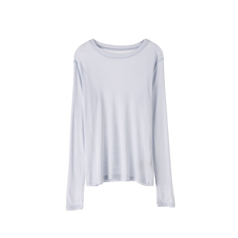 Acetate+Tencel Lyocell Bottoming Shirt Women's Spring And Summer Round Neck Cardigan Long Sleeve T-shirt Micro-transparent Outerwear Knitted Cardigan