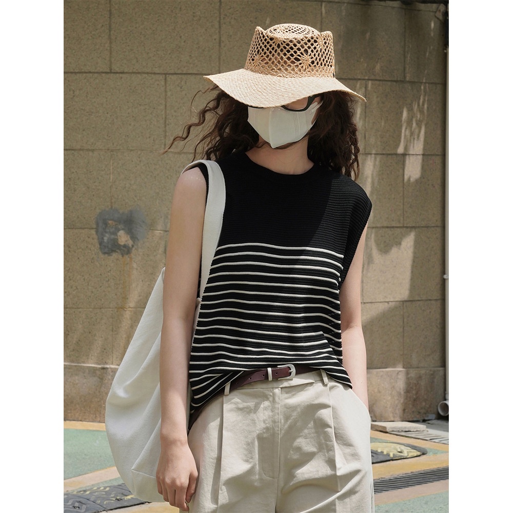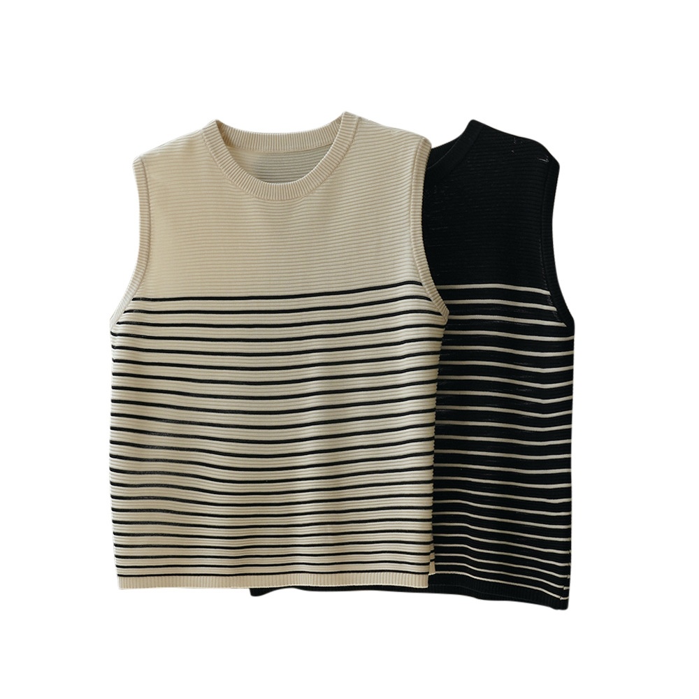 Summer Korean Retro Striped Tencel Sleeveless Sweater Loose Slim Breathable Casual Vest For Women