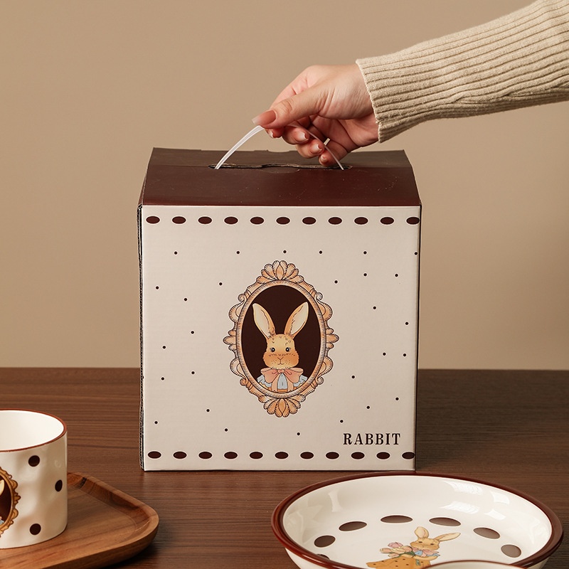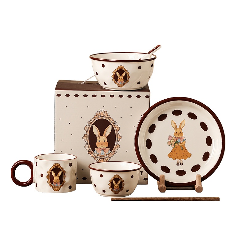 Creative Retro Rhea Rabbit Bowl And Plate Set For One Person Ceramic Tableware Opening Real Estate Souvenir Bowl Gift Box