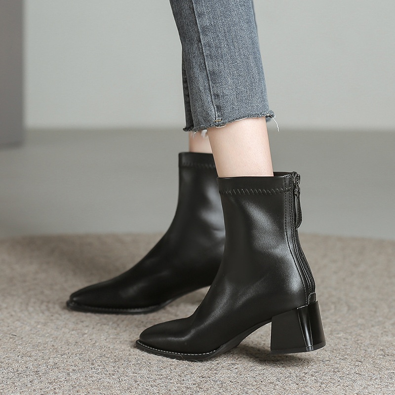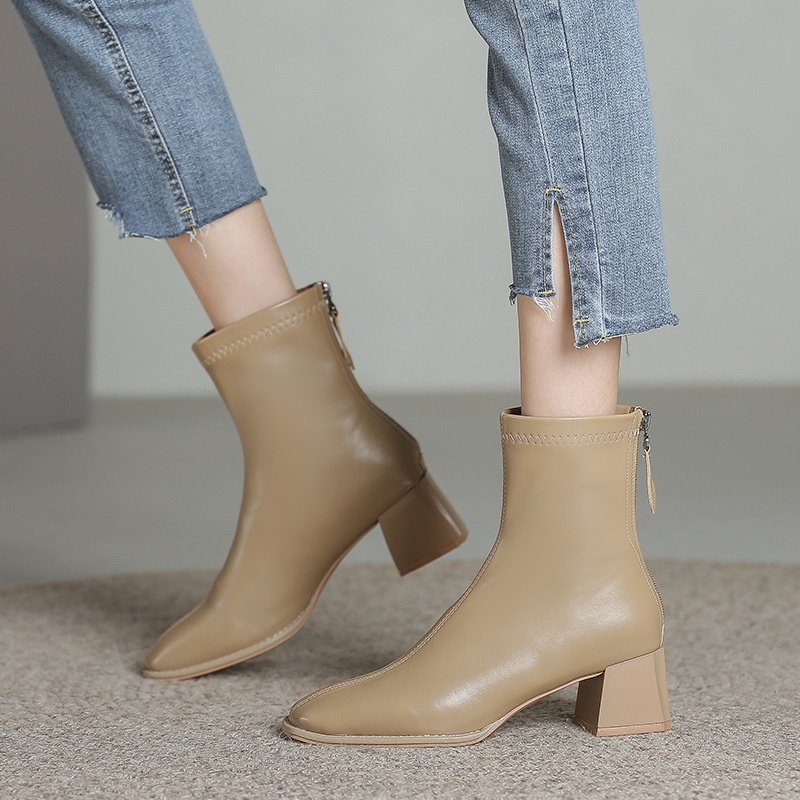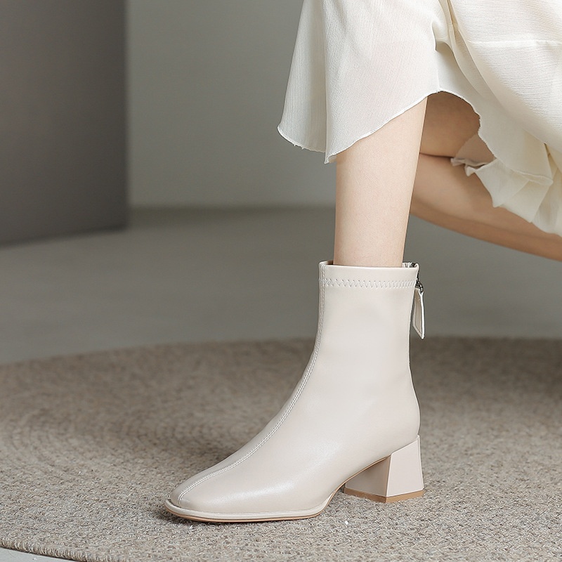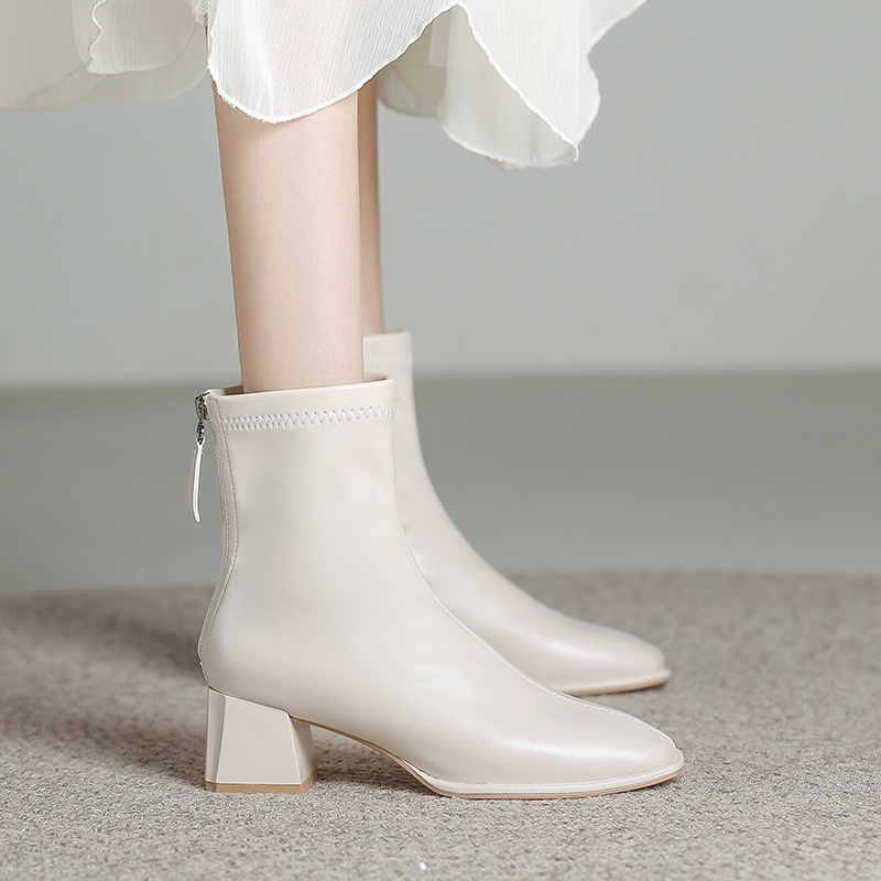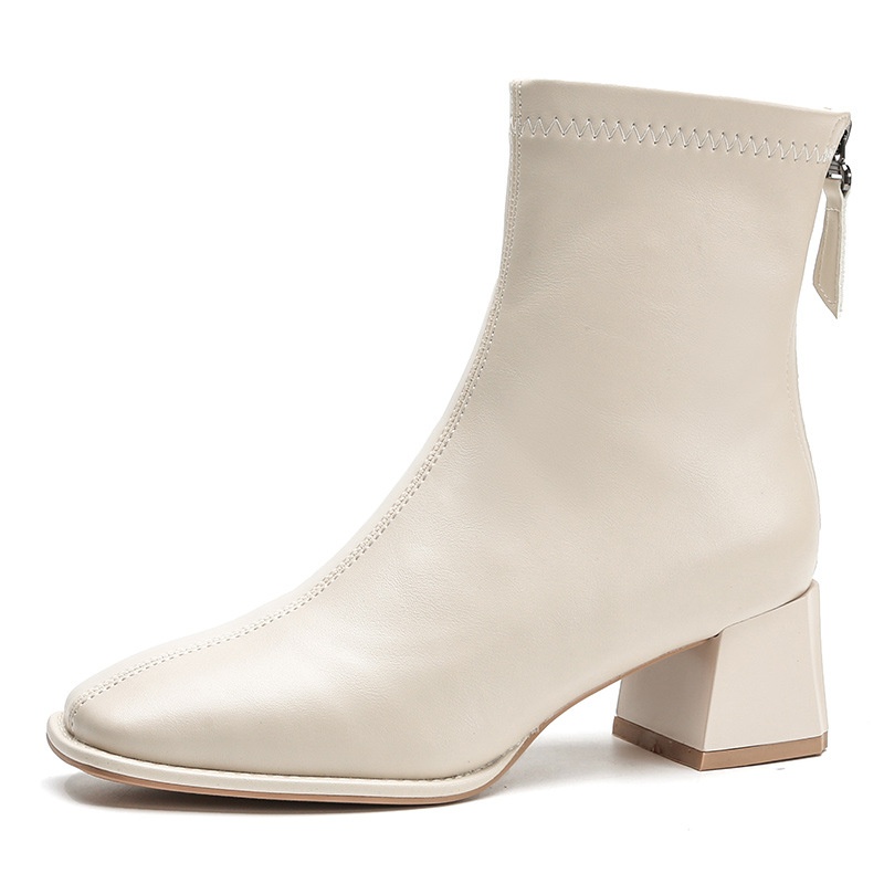 Beige Martin Boots For Women Autumn And Winter Rear Zipper Plus Velvet Cotton Shoes Square Toe High Heels Thick Heels Skinny Short Boots