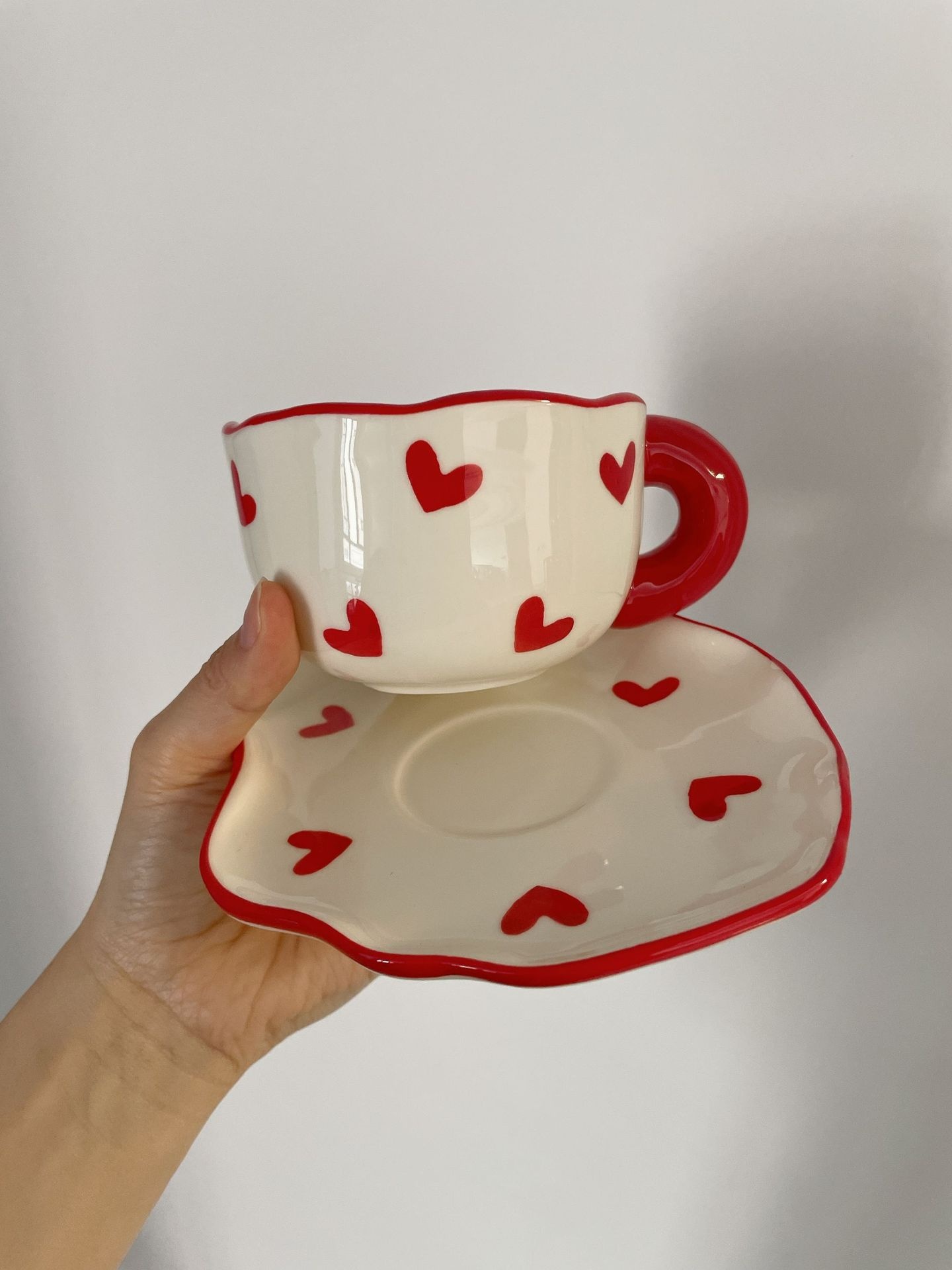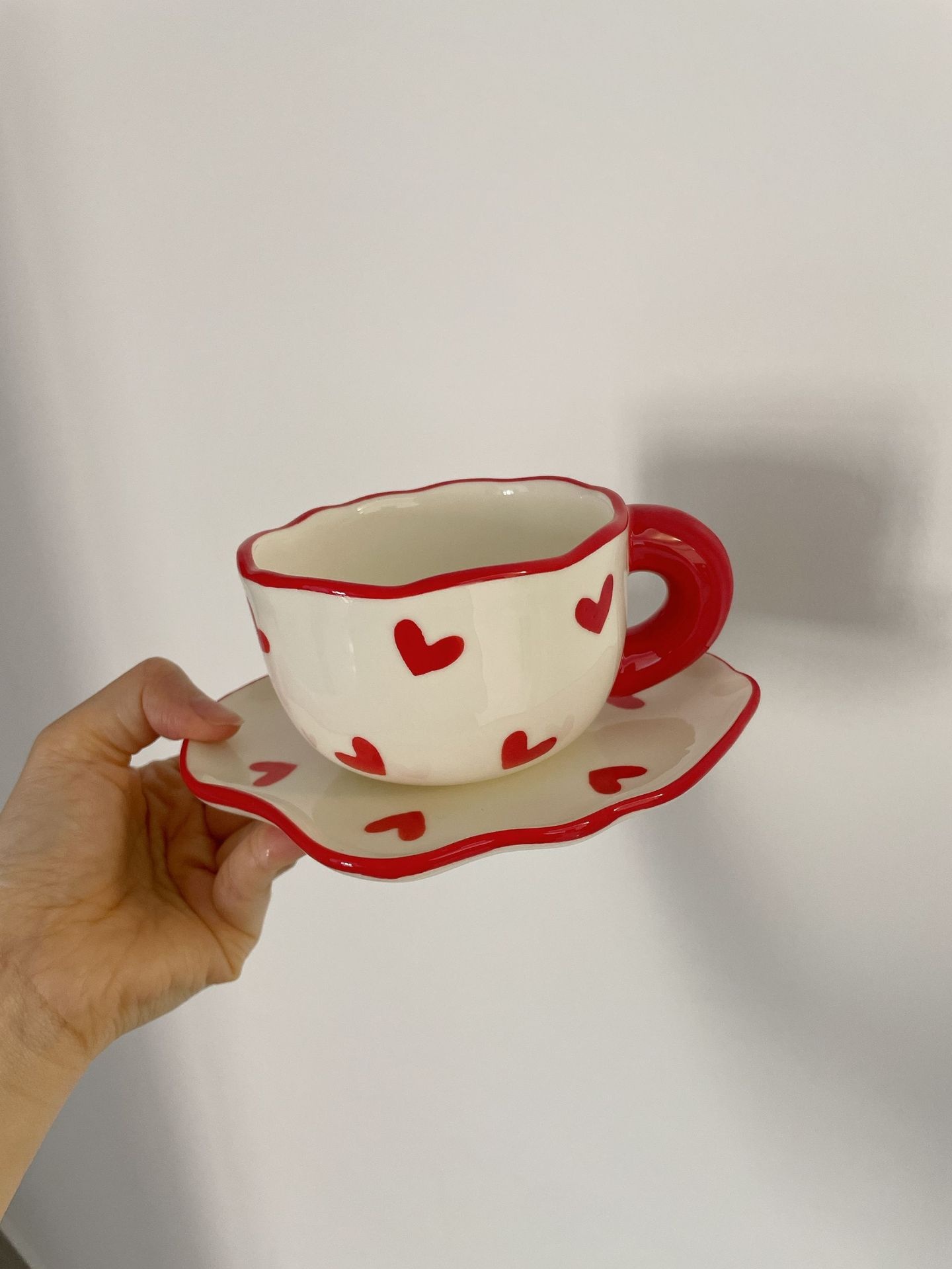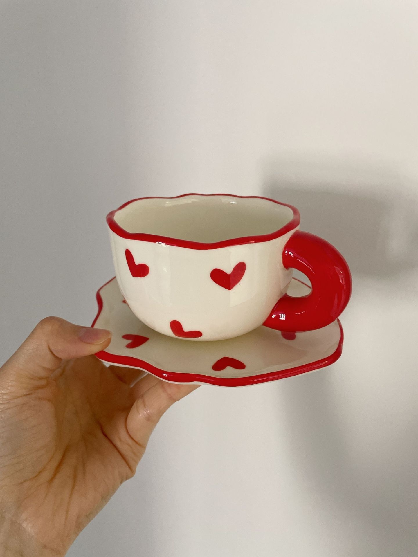 Overseas!Super Cute Hand-painted Red Heart Hand-pinched Coffee Cup And Saucer Set Afternoon Tea Flower Tea Cup