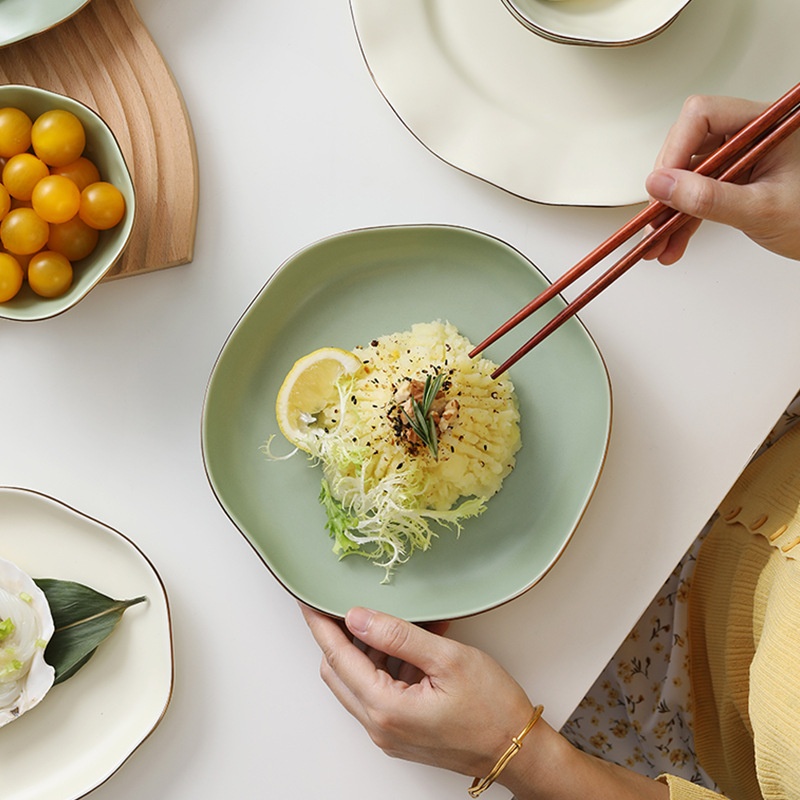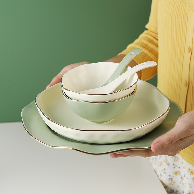European Light Luxury Microwave Gold Edge Ceramic Tableware Creative Simple Color Glaze Household Rice Bowl Soup Plate Spoon