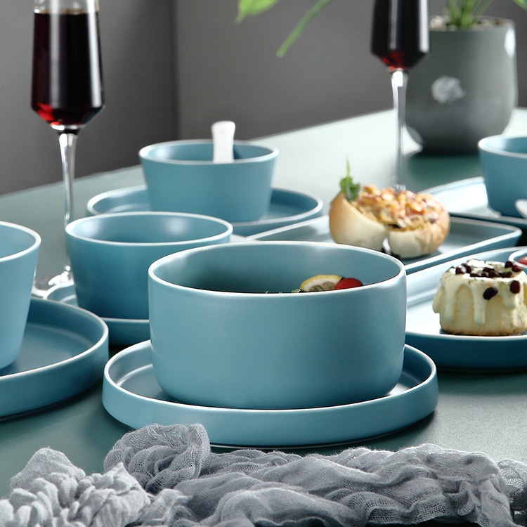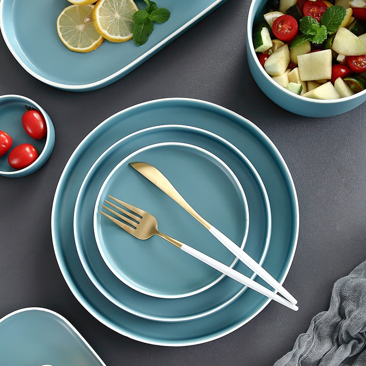 Simple Creative Ceramic Tableware Set European Style Light Blue White Edge Rice Soup Bowl Steak Fish Plate Dish Home Restaurant