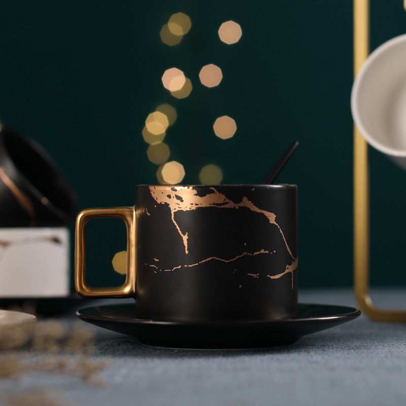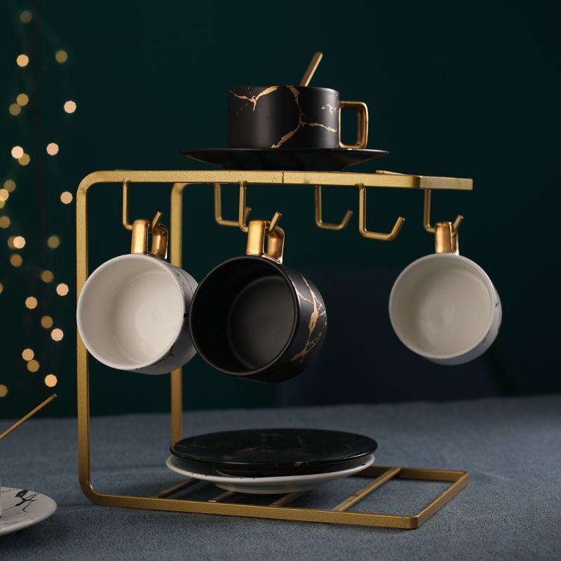 European Style Simple Ceramic Coffee Cup And Saucer Set With Iron Frame Creative Color Glaze Marble Pattern Gold Coffee Set