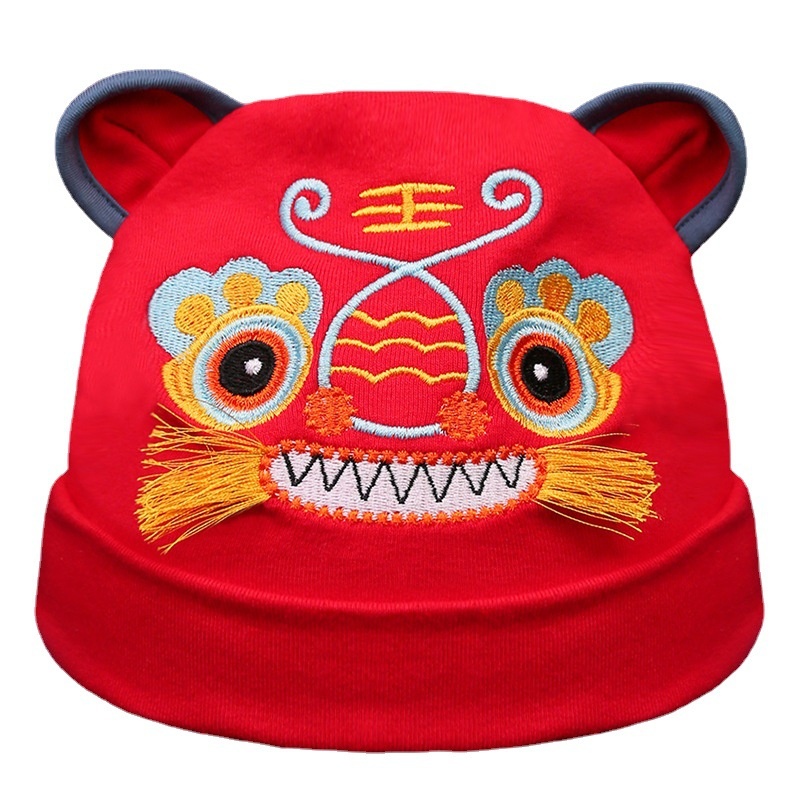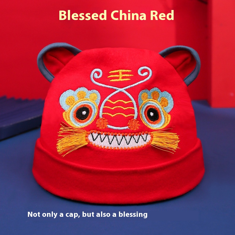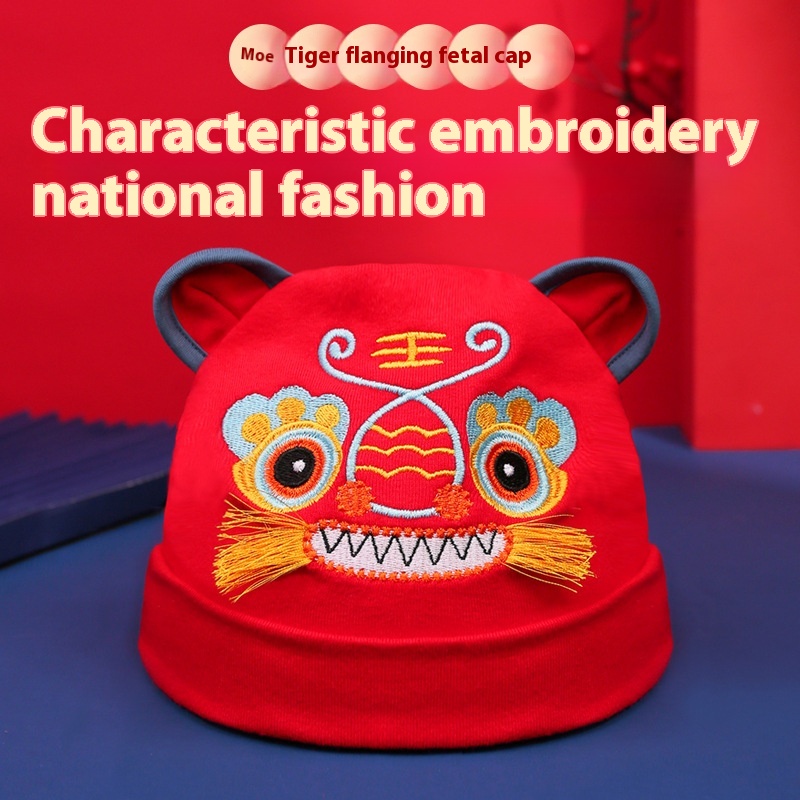 Tiger Head Hat Baby Hat Red Full Moon100 Days Old Baby Hat Fetal Hat Spring And Autumn Chinese Style Embroidery Turn-up Hat