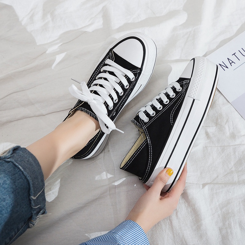 Summer Height-enhancing Half-slip Canvas Shoes For Female Students Lazy Two-wear White Shoes Korean Thick-soled Sneakers