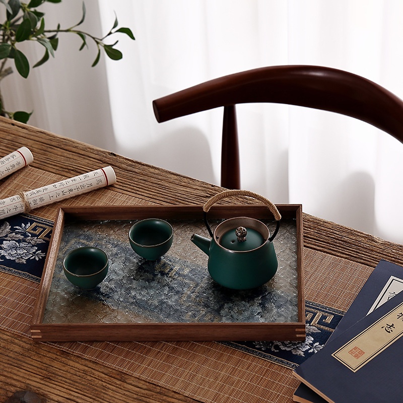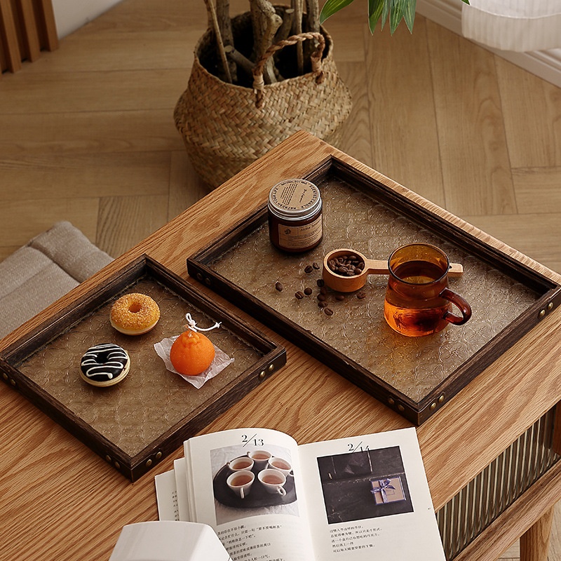 Retro Begonia Flower Glass Tray Household Rectangular Walnut Tea Tray Creative Tea Tray Fruit Dessert Wooden Tray