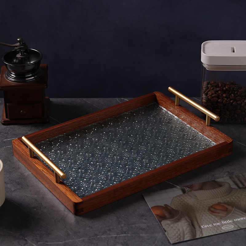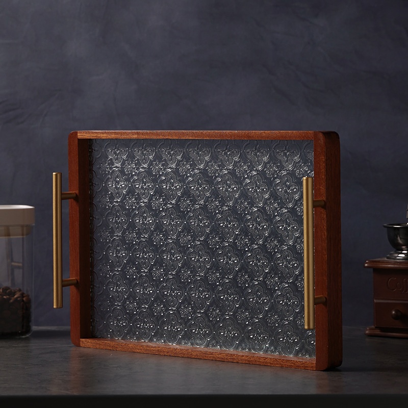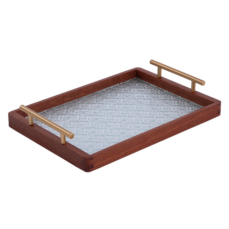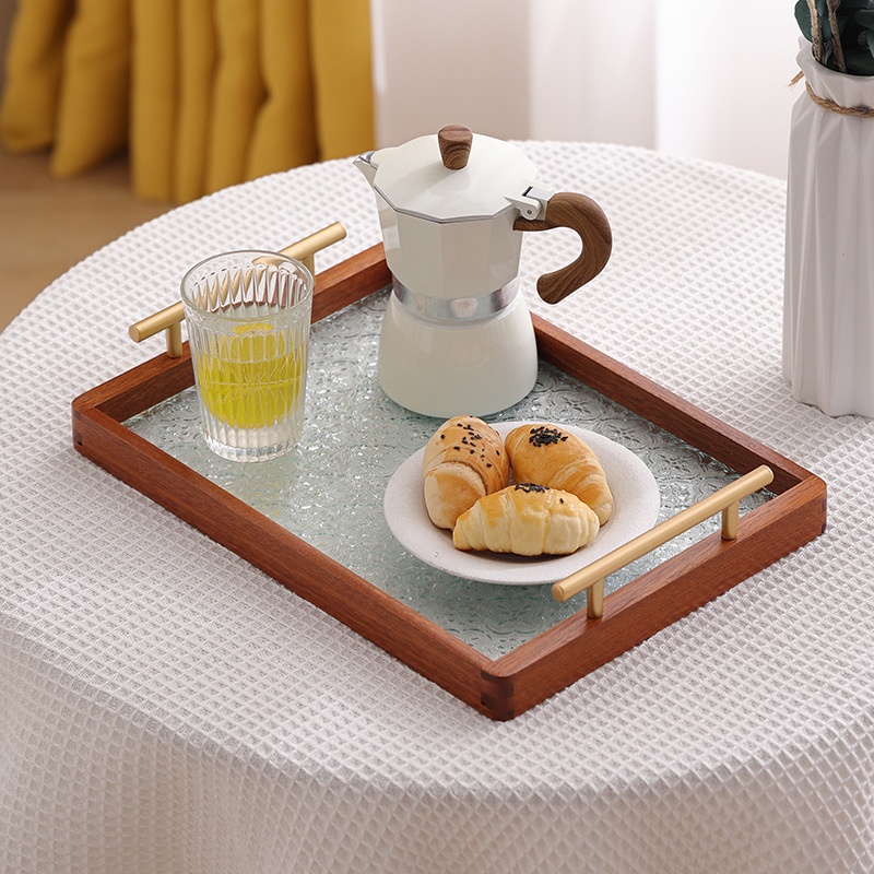 Retro Begonia Flower Glass Tray Household Sapele Tea Tray Solid Wood Breakfast Tray Cup Storage Fruit Dessert Tray