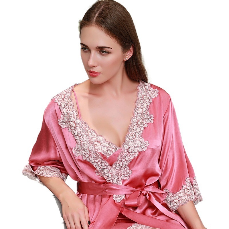 Silk Pajamas Women's Heavy Mulberry Silk Autumn Floral Kimono Bathrobe Cardigan Nightgown With Suspenders Two-piece Set