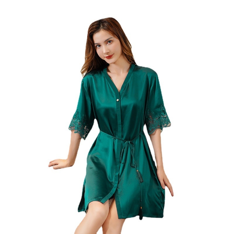 Silk Pajamas Women Spring And Summer Short Sleeve Sexy Nightgown100%Mulberry Silk Heavy Silk Multicolor Cardigan Thin Lace