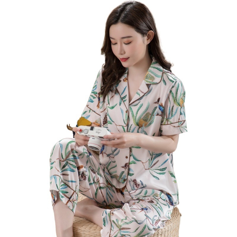Spring And Summer Women's Home Clothes Two-piece Set Fresh And Simple Printed Imitation Silk Pajamas One Piece Dery