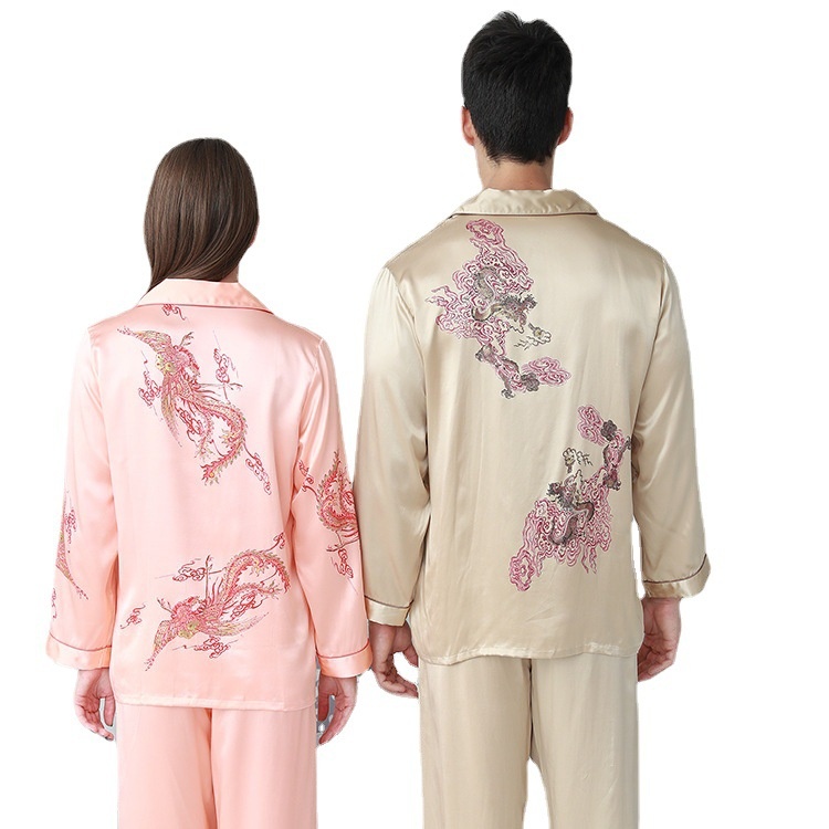 Spring And Autumn Silk Sleepwear Silk Silk Embroidery Couple Homestays Long Sleeve Trousers Set