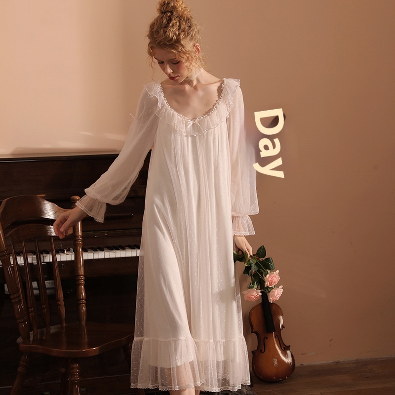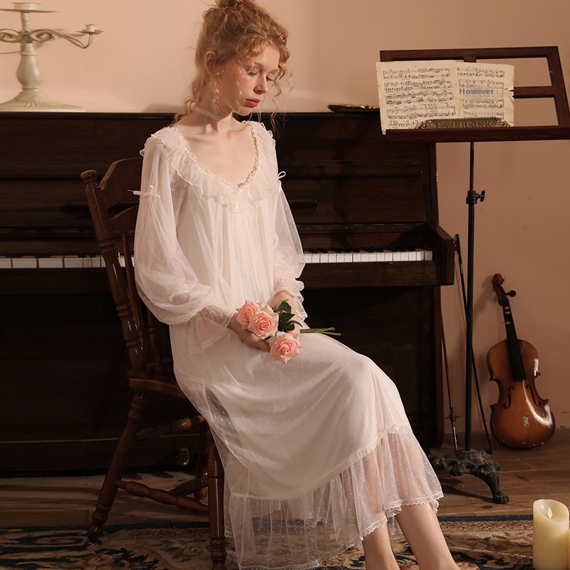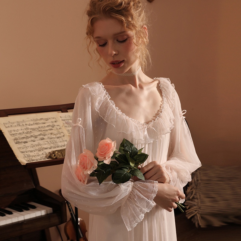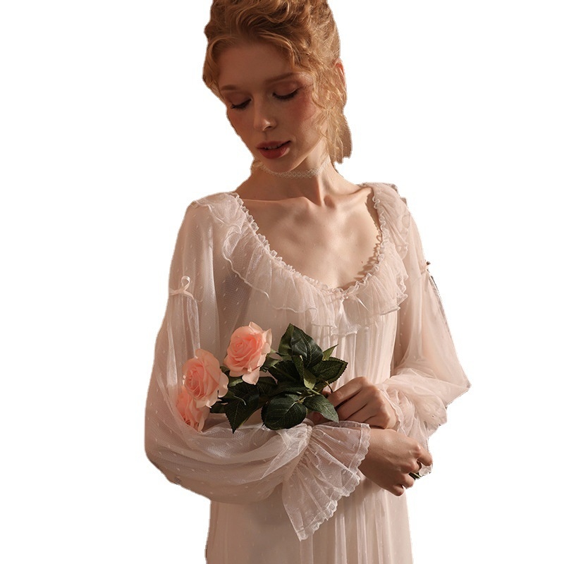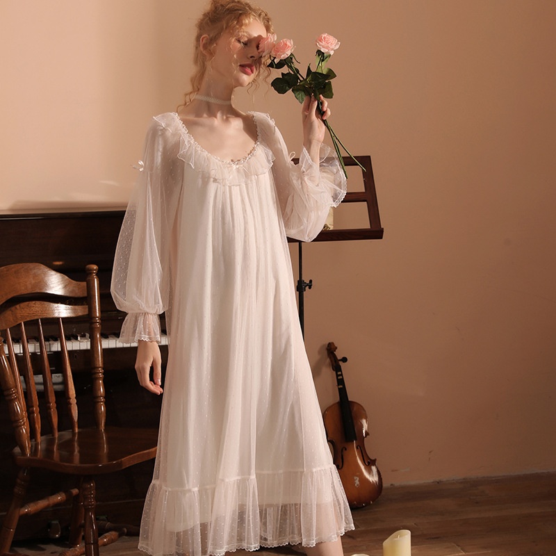 Classic Round-neck Polka Dot Mesh Fairy Nightdress,Noble And Romantic Nightdress,One-piece Nightdress,Home Clothes,Loose And Comfortable