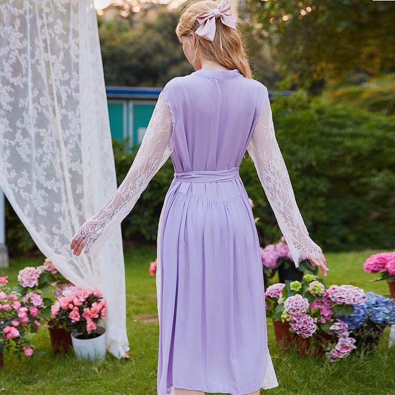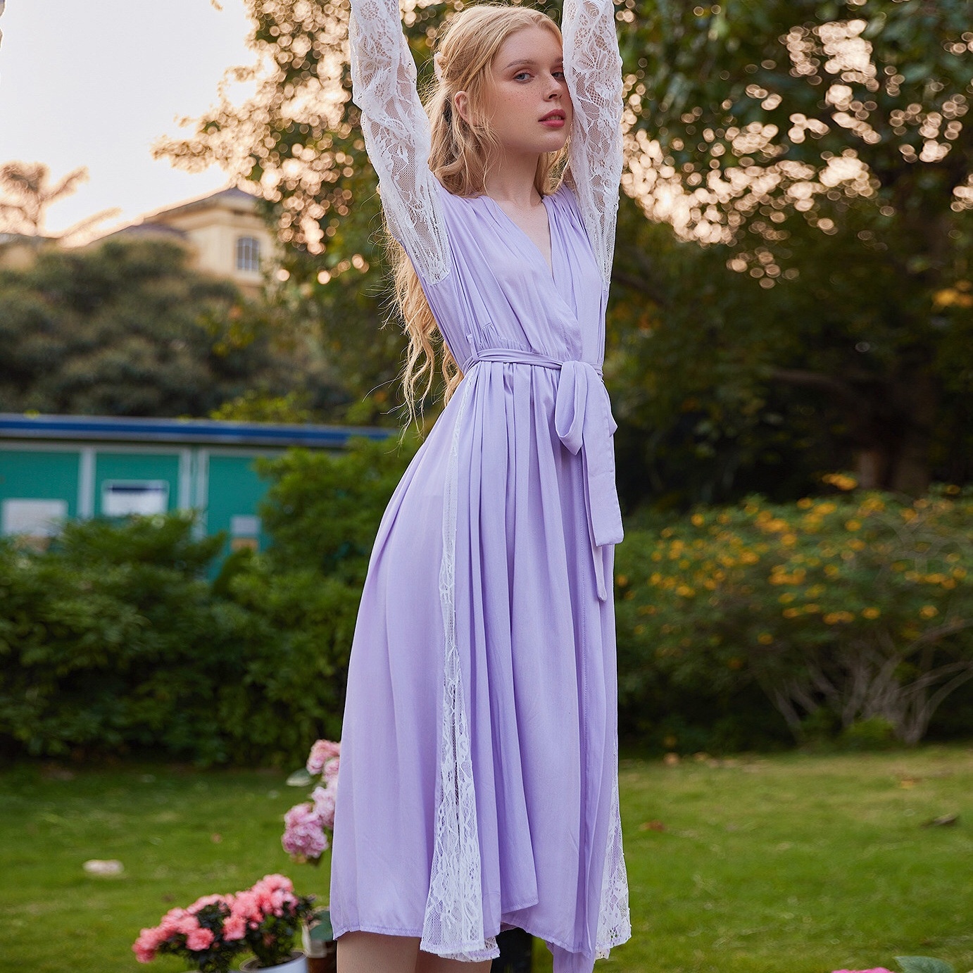 Spring And Autumn Sexy Lace Sleeve Solid Color Cardigan Long Skirt Holiday Style Dress Lace Sleeve Nightgown Home