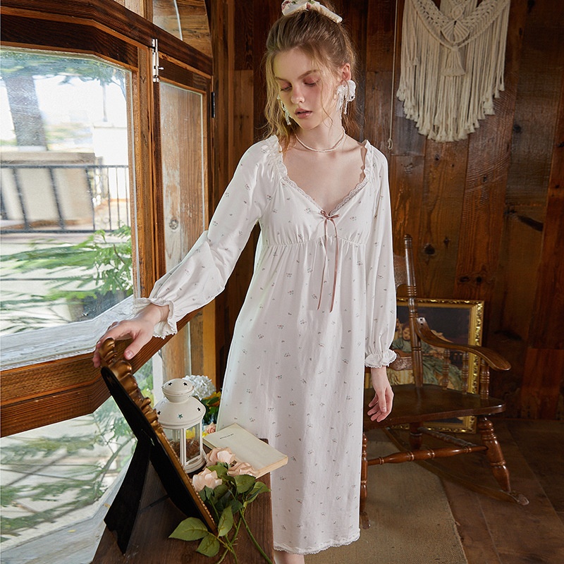 Retro Printed With Chest Pads,Large Neckline,Small Wooden Ears,V-neck Pajamas,Long Skirt,Odell Home Clothes,Fairy Nightgown