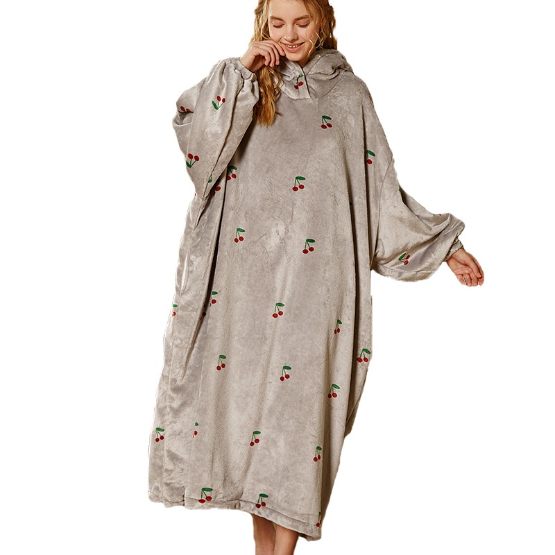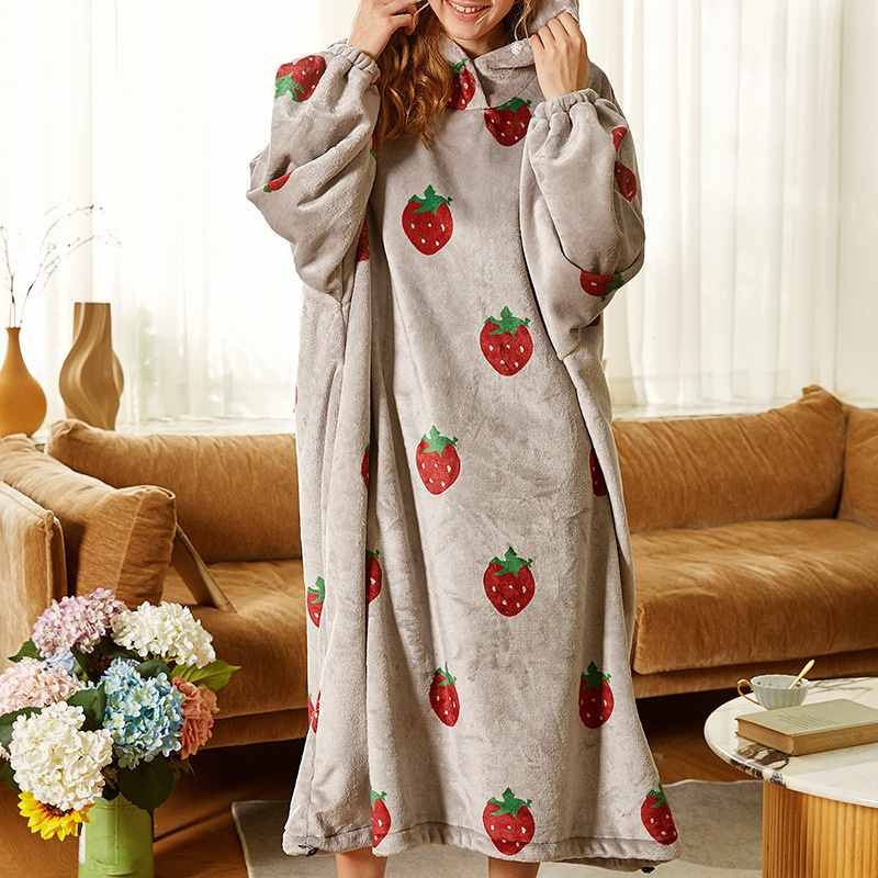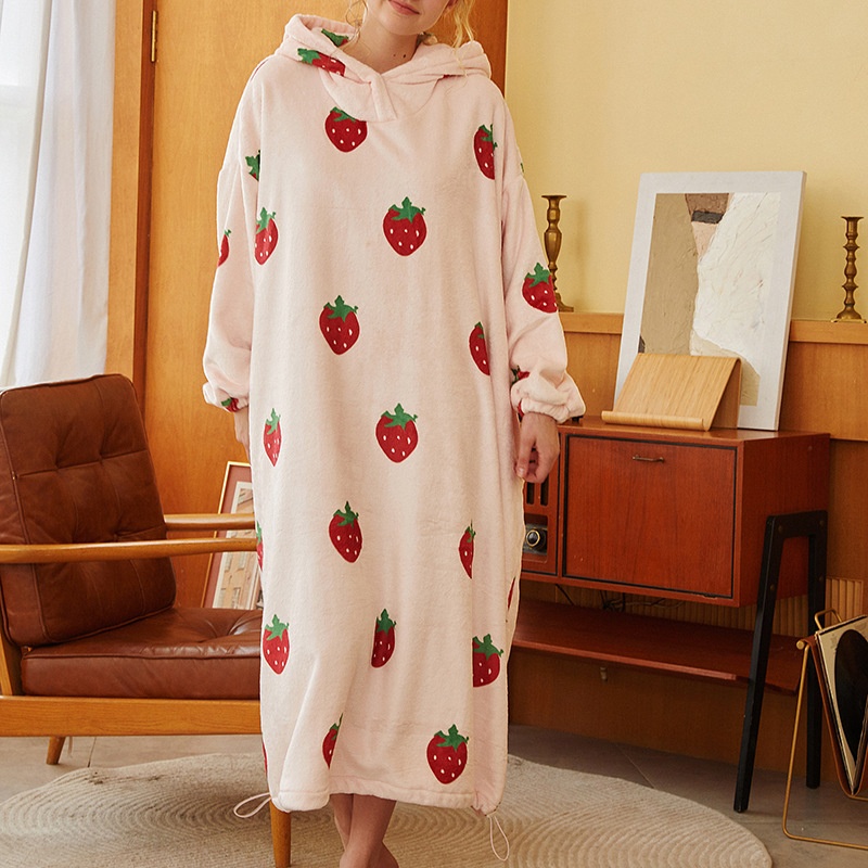 Printed Strawberry Cherry Soft Long-sleeved Nightdress Cute Warm Hooded Drawstring Loose Home Clothes