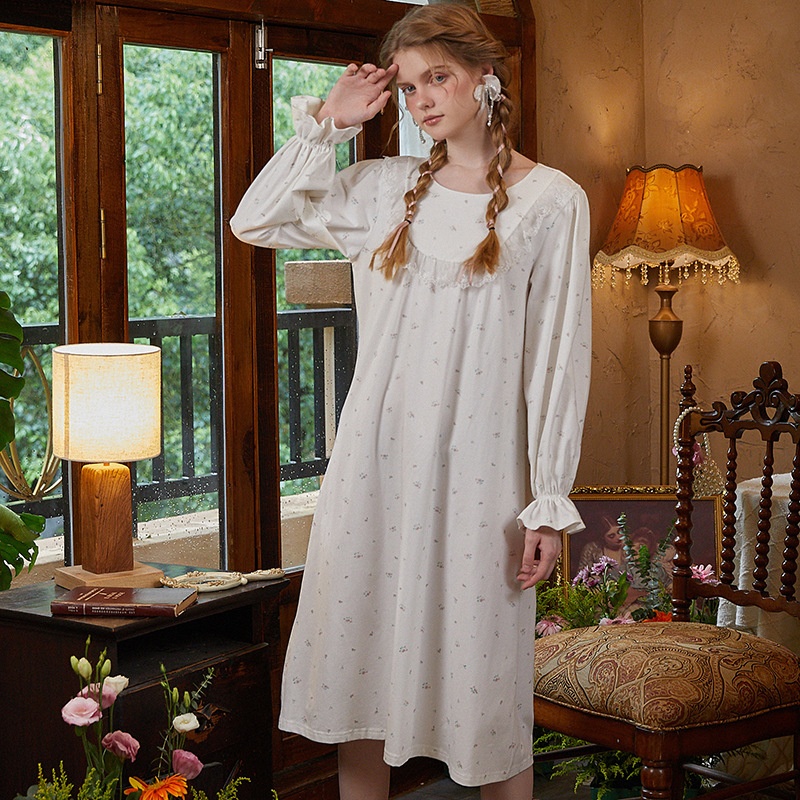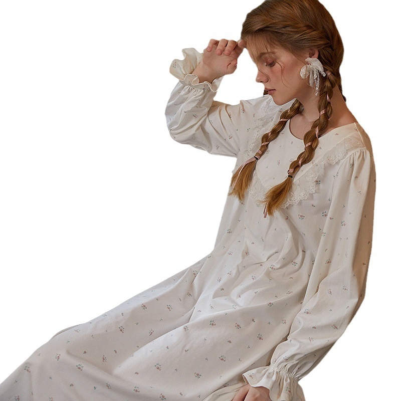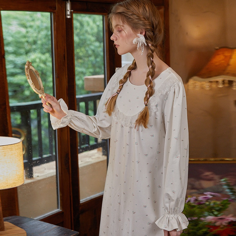 Palace Retro Style Printed Long Sleeve Loose Nightdress For Women Autumn Style Sweet Girl Princess Style Nightdress Pure Cotton Home Clothes