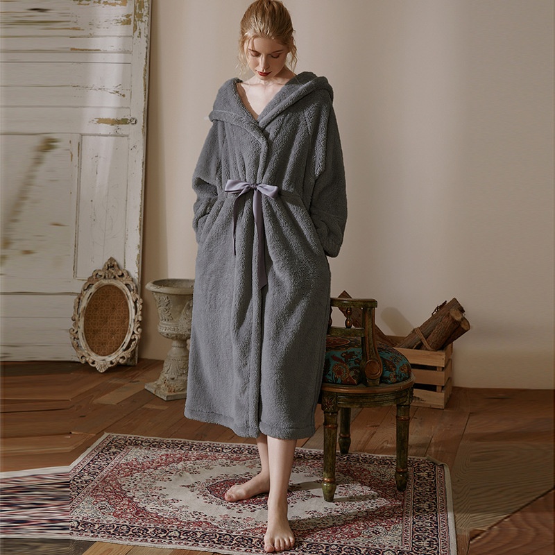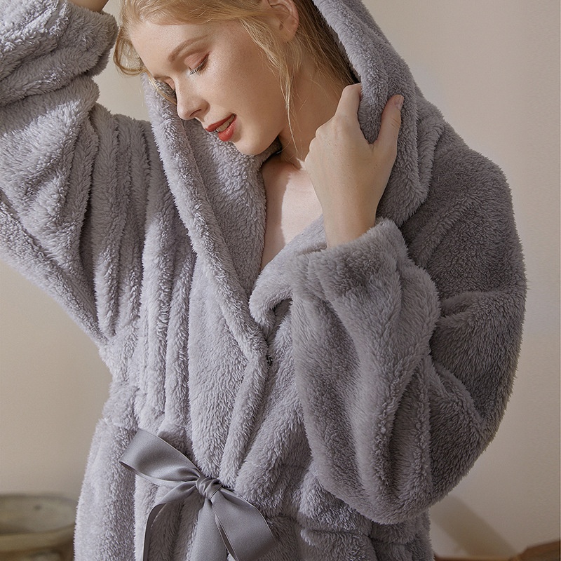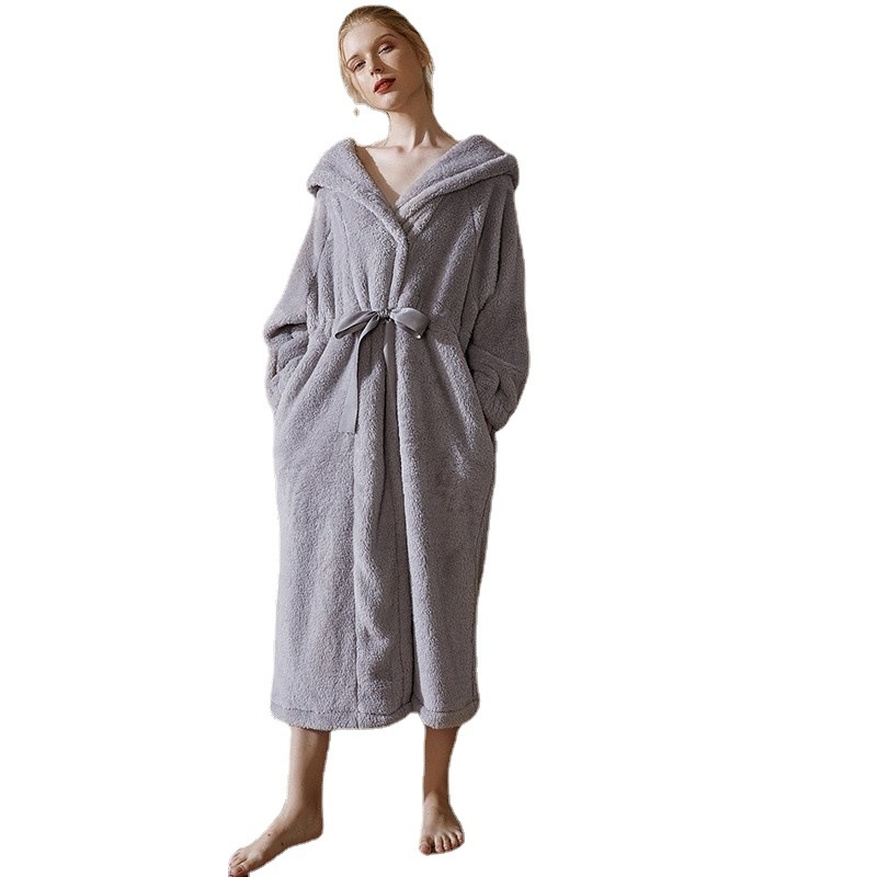 Double-sided Thick Velvet Hooded Pocket Straps Warm Ladies Nightgown Can Be Worn As AHome Clothes