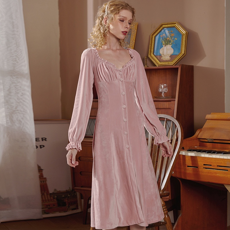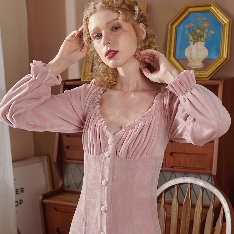 CMOriginal Thickened Double-sided Fine Mink Velvet Slim Button Nightdress Cardigan Peach Collar Waist Retro Home Clothes Pajamas