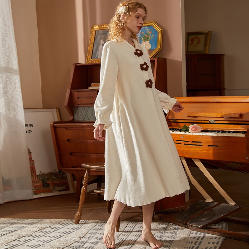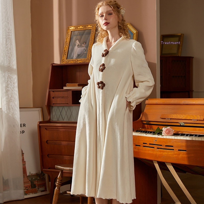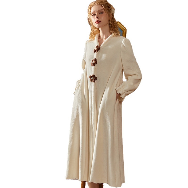 CMOriginal Retro Thick Velvet Nightgown Wool Large Flower Decoration Pocket Warm A-line Version Home Clothes Can Be Worn Outside