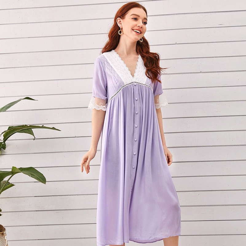 Summer Palace Sexy Lace V-neck Long Sleeve Loose Solid Color Cotton Silk Nightdress Female Long Girlfriend Home Clothes Pajamas