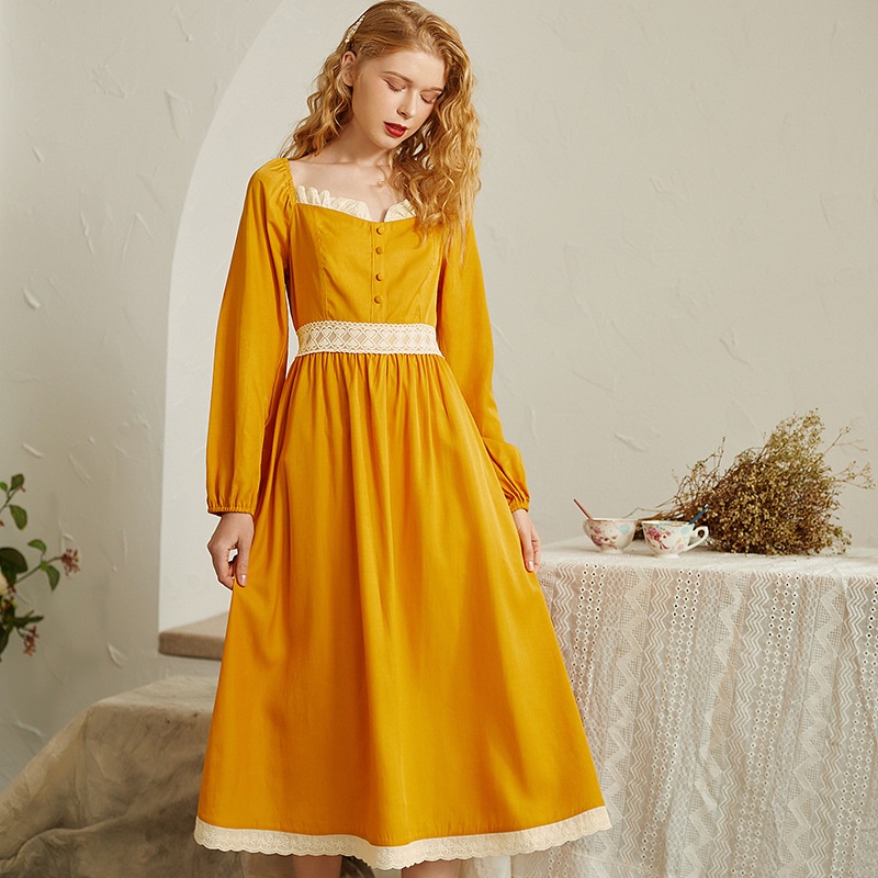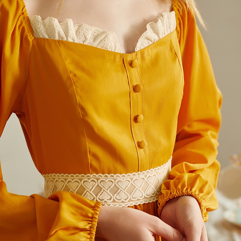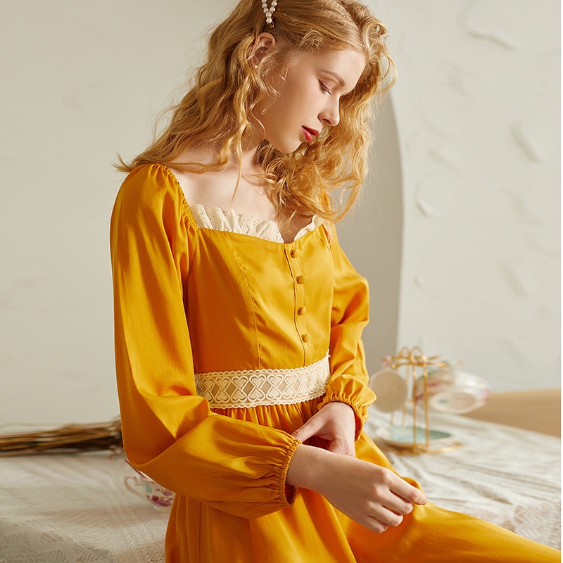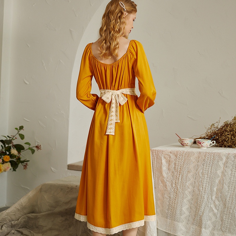 Arrival Candy Solid Color Lace Splicing Princess Palace Style Long Sleeve Waist Tie Long Nightgown Home Clothes