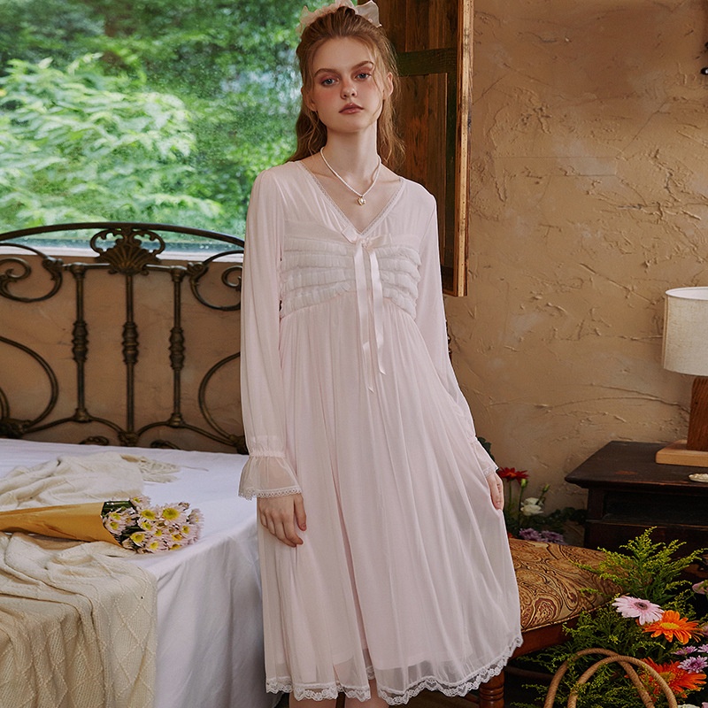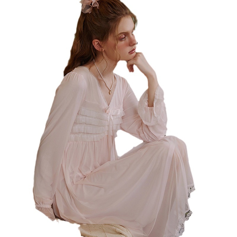 Multi-layered Ruffle Design Small V-neck Bow Mesh Nightdress For Girls Soft Skin-friendly Loose Version Large Size