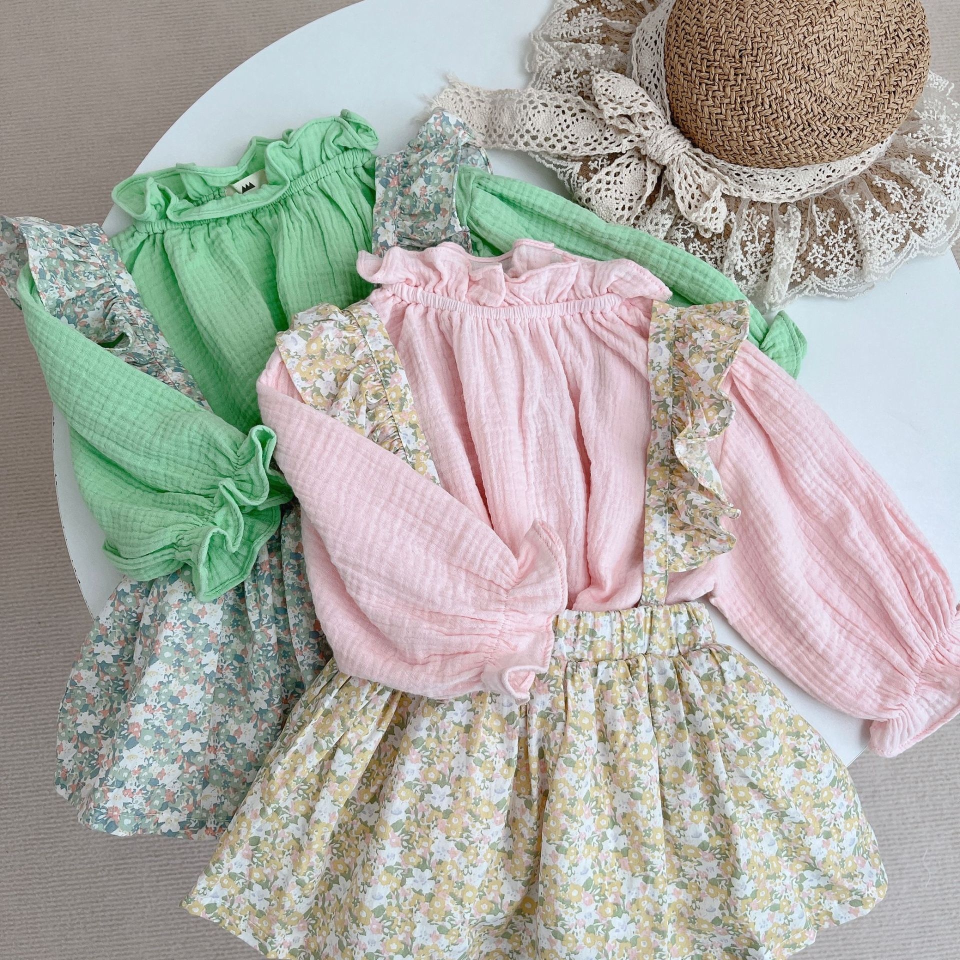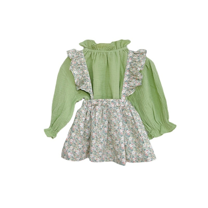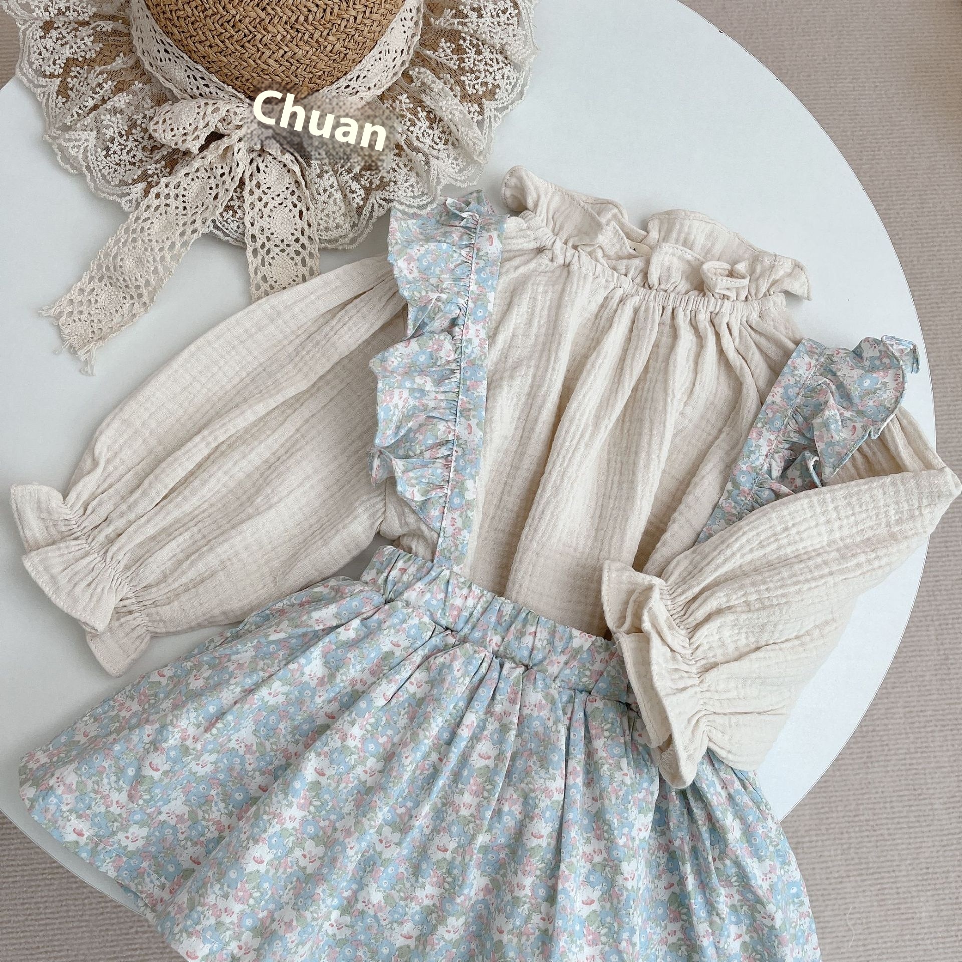 Girls Cotton Puff Sleeve Pullover Top Spring And Autumn Baby Children's Clothing Floral Sling Short Skirt
