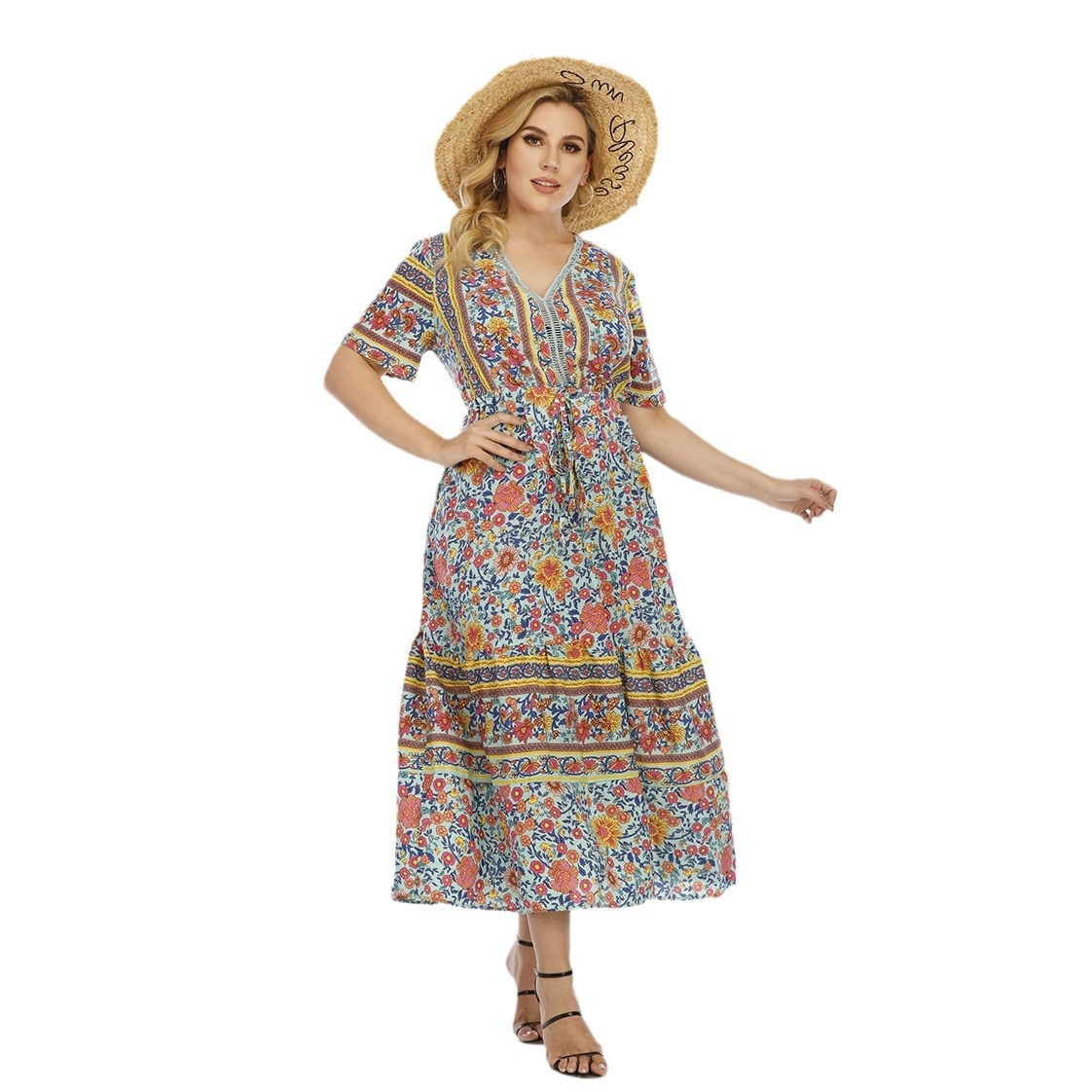 USABohemian Plus Size Dress200 Pounds Can Wear Fat Lace Splicing Long Dress