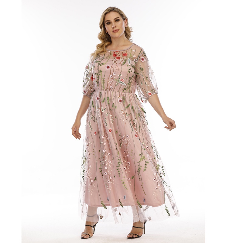French Hepburn Style Plus Size Dress Evening Dress Female Mesh Embroidery Banquet Party Midi Dress