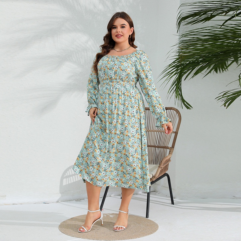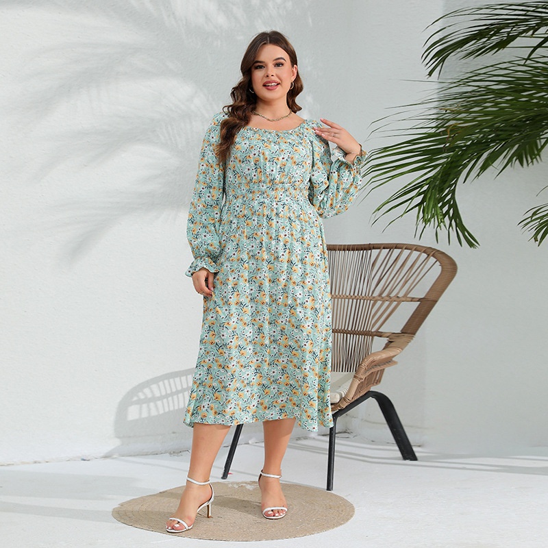 American Spring Elegant Floral Dress Lotus Leaf Sleeve Large Size Fat Girl Long Skirt