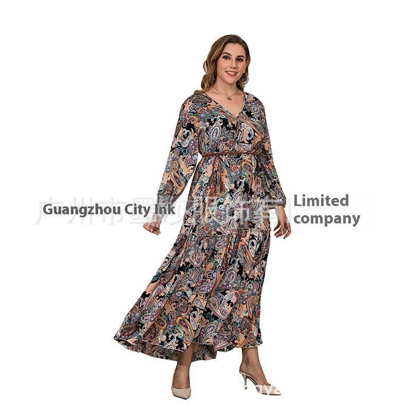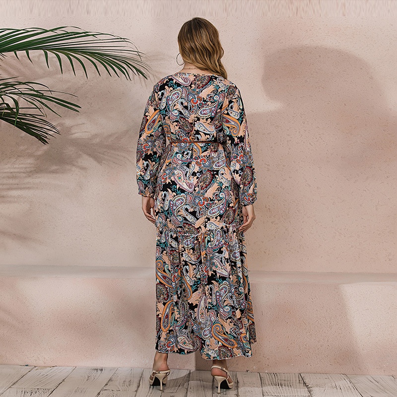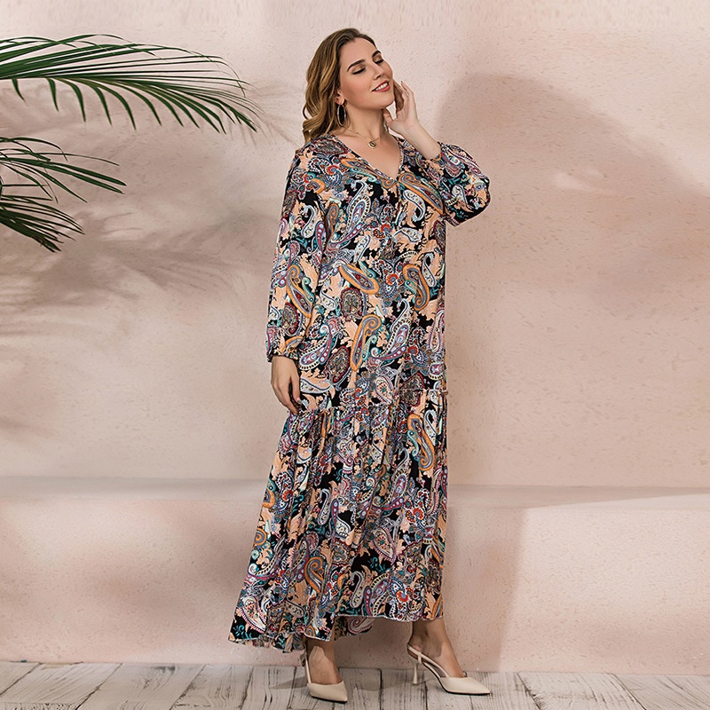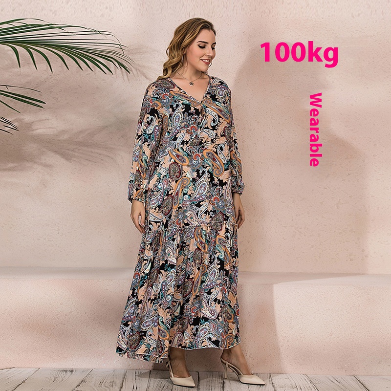Spring And Summer Retro Paisley Plus Size Dress Fat Mm Loose Long Sleeve Large Swing Long Dress