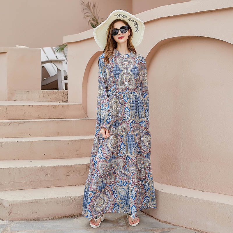 Bohemian Spring Style Temperament Long Sleeve Plus Size Dress Female Retro Print Forest Series Fat Mm Can Wear Long