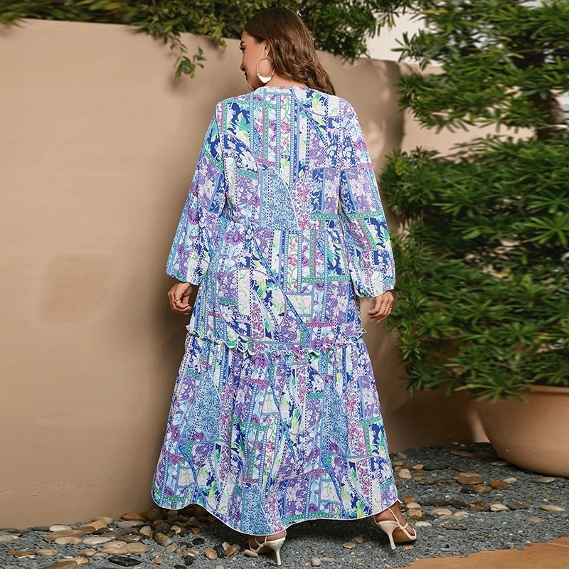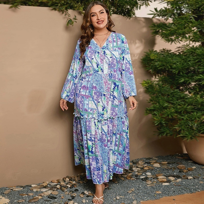USASpring And Autumn Large Size Dress Chiffon Print Long Sleeve V-neck Loose Long Dress