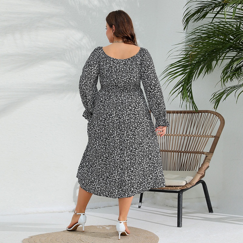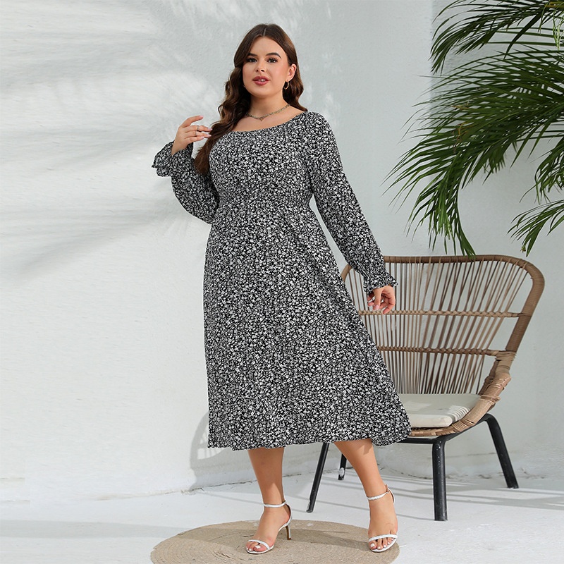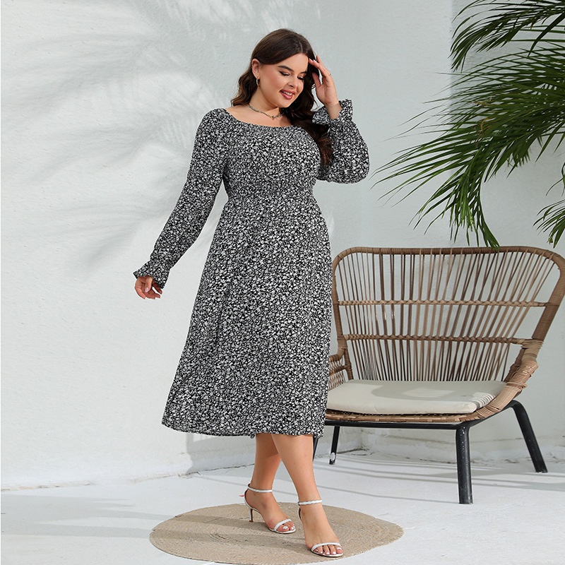 Spring Large Size Long Sleeve Dress Floral Elastic Waist Elegant Long Dress Dress Lotus Leaf Sleeve
