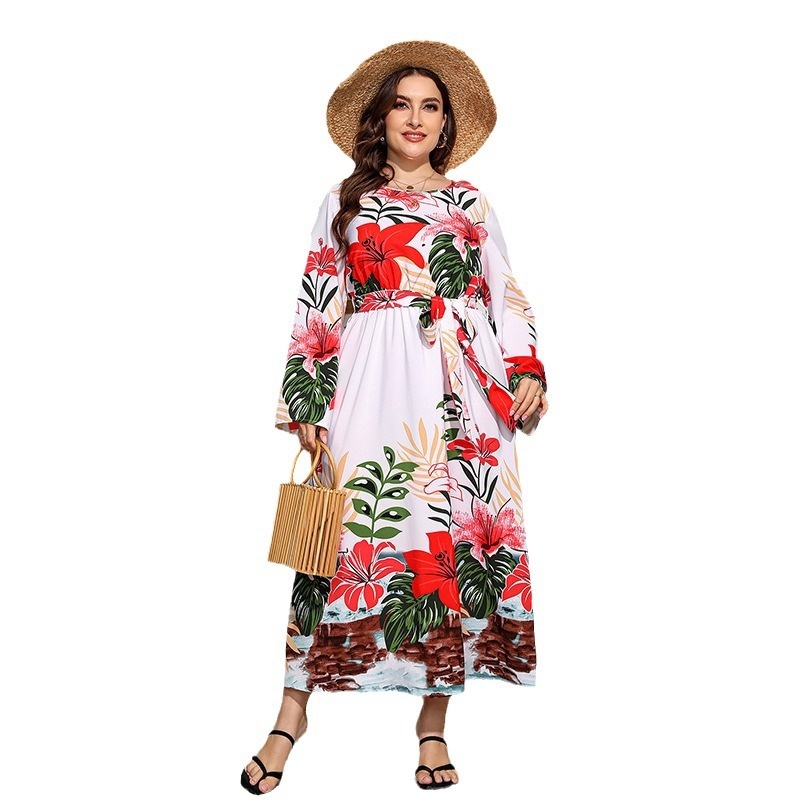 European And American Hot-selling Large-size Printed Long-sleeved Dress With High Waist And Tie-up,Holiday Style,Long Skirt