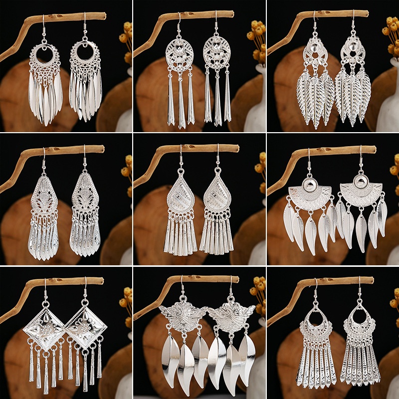 Imitation Silver Miao Earrings,Ethnic Minority Tourist Attractions,Earrings,Bohemian Long Leaf Tassel Earrings