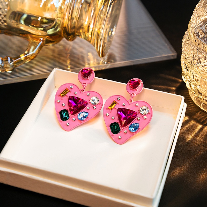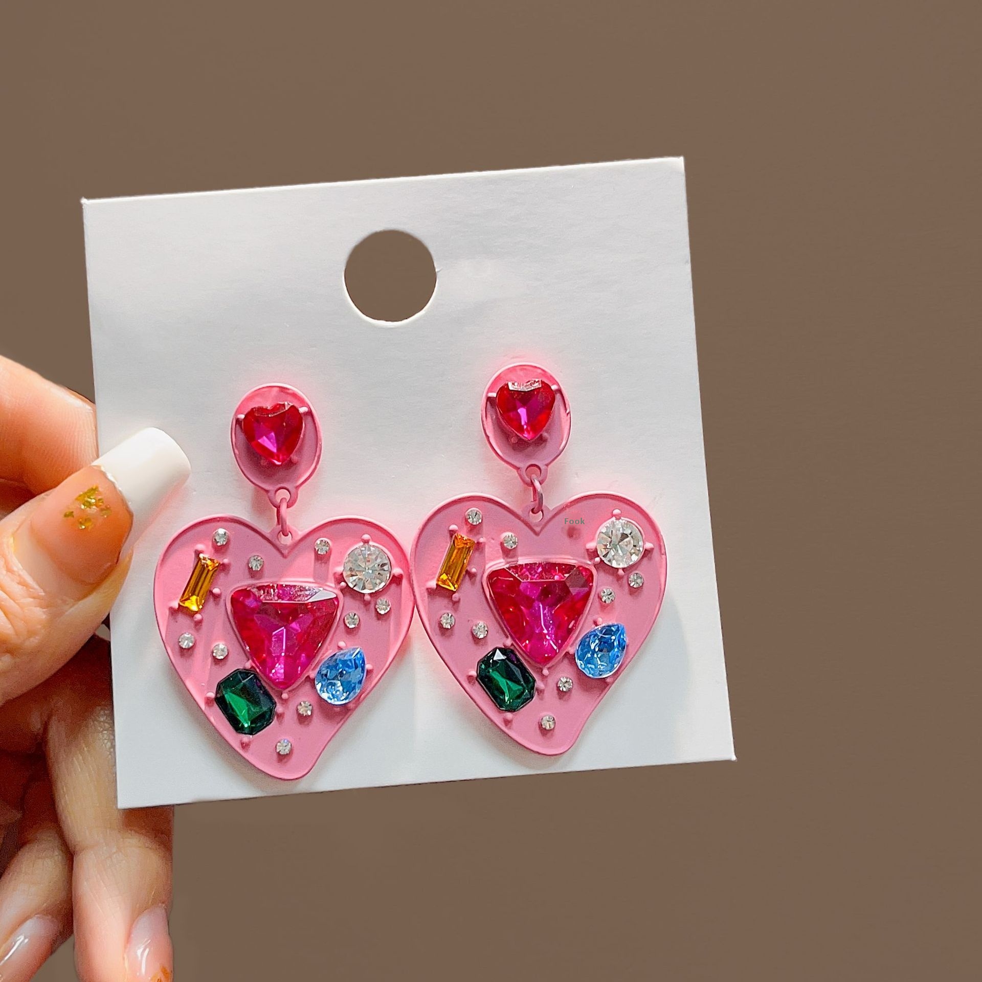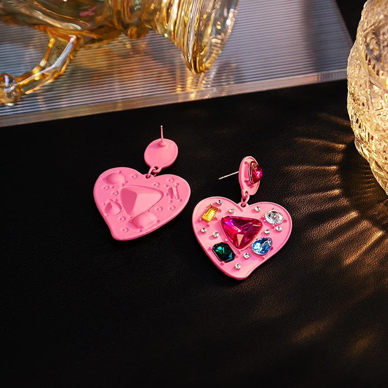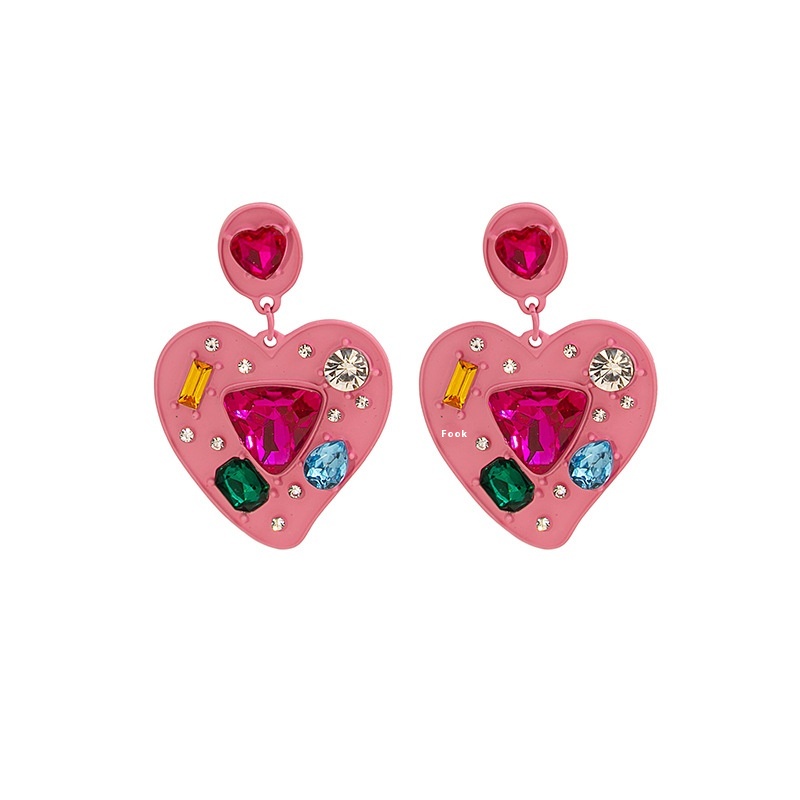 Silver Needle Pink Rhinestone Diamond Heart Earrings European And American Creative Exaggerated Fashion Spray Paint Earrings Female