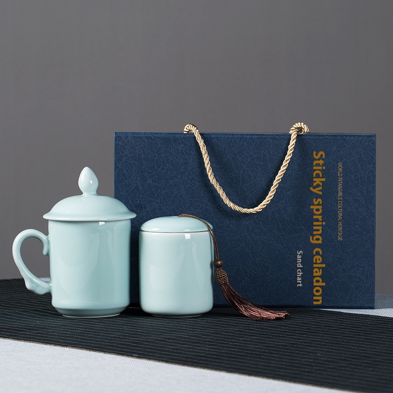 Empty Mountain Rain Longquan Celadon Office Tea Cup Tea Can Two-piece Gift Box Ceramic Gift Cup Business Set