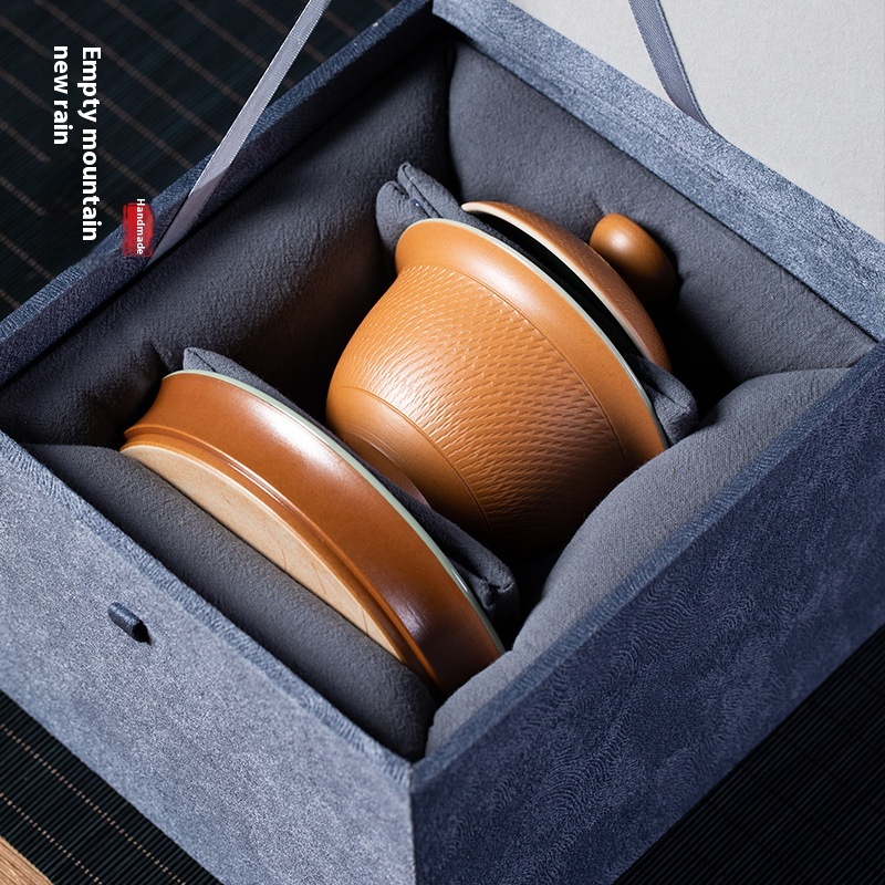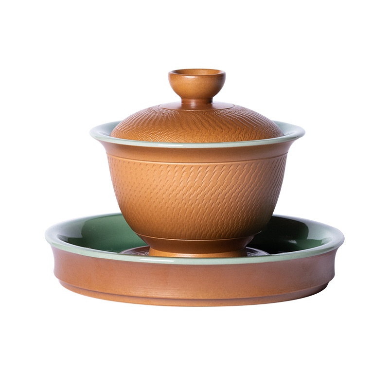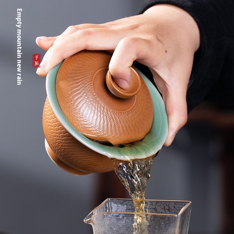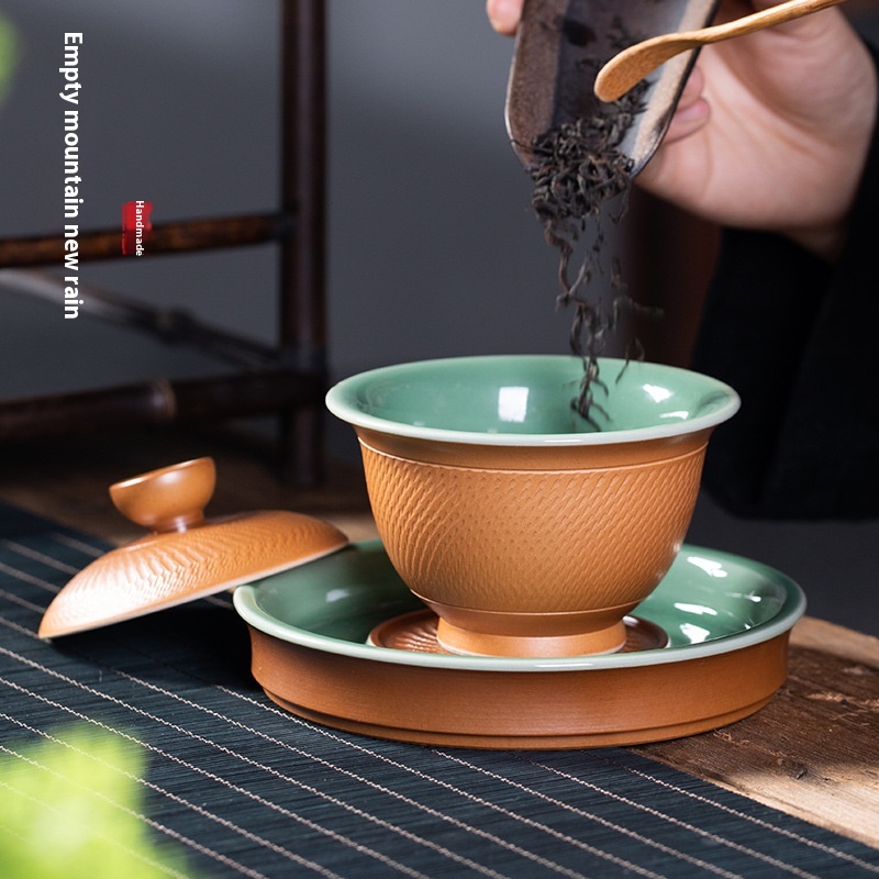 Empty Mountain Rain Longquan Celadon Pure Work Jumping Knife Sancai Covered Bowl Ceramic Kung Fu Tea Set Large Tea Bowl Teacup