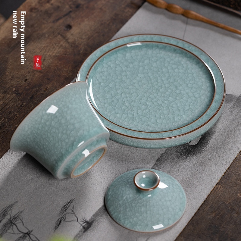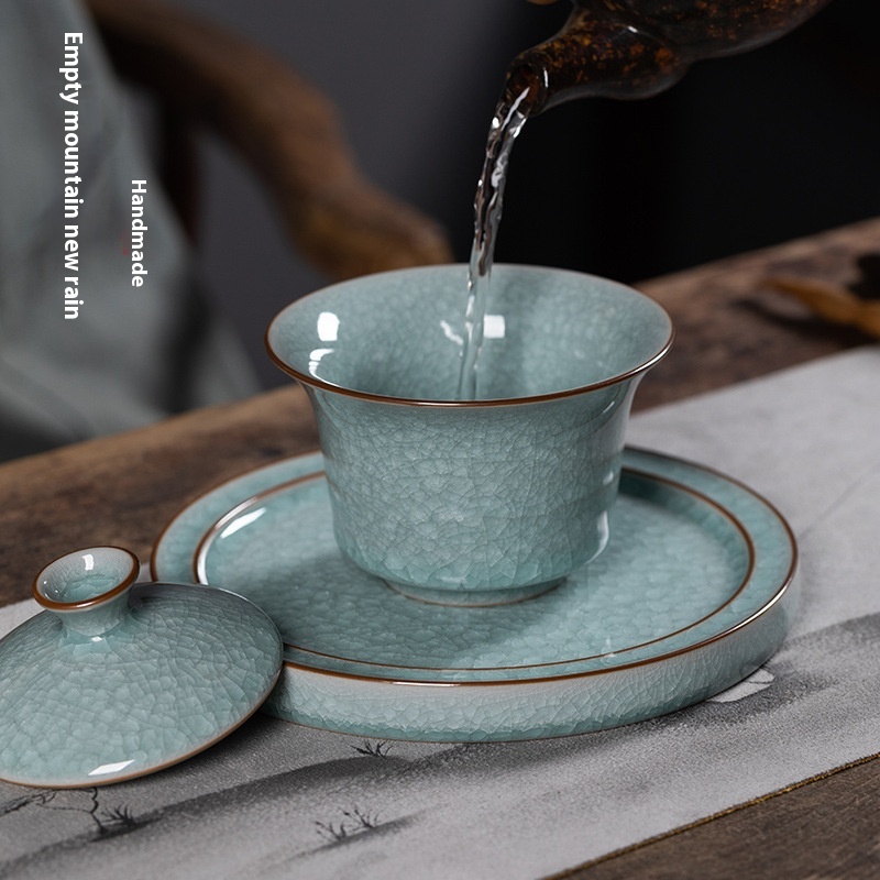 Empty Mountain Rain Longquan Celadon Sancai Covered Bowl Large Tea Cup Ceramic Ice Flower Ice Crack Hand-Grabbed Tea Bowl