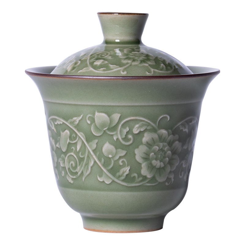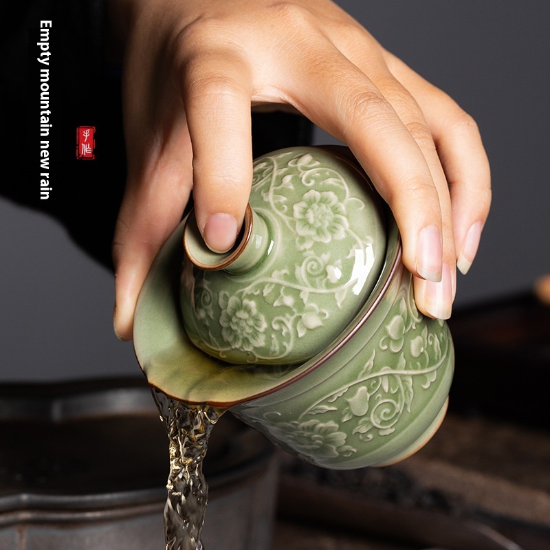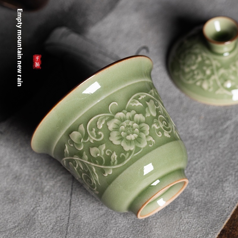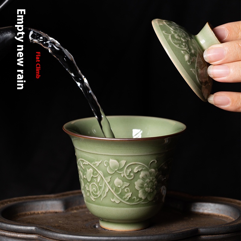 Empty Mountain Rain Longquan Celadon Two-Cai Covered Bowl Retro Tea Bowl Ceramic Chinese Kung Fu Tea Cup Tea Bowl