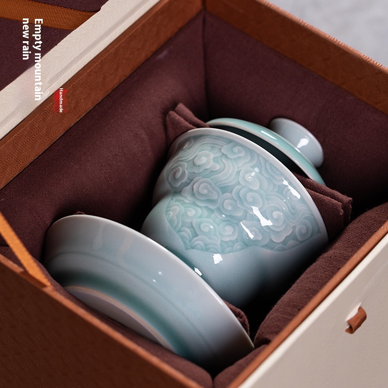 Empty Mountain Rain Longquan Celadon Sancai Covered Bowl Large Capacity Tea Brewing Tea Bowl Ceramic Handmade Kung Fu Hand-Grabbed Bowl