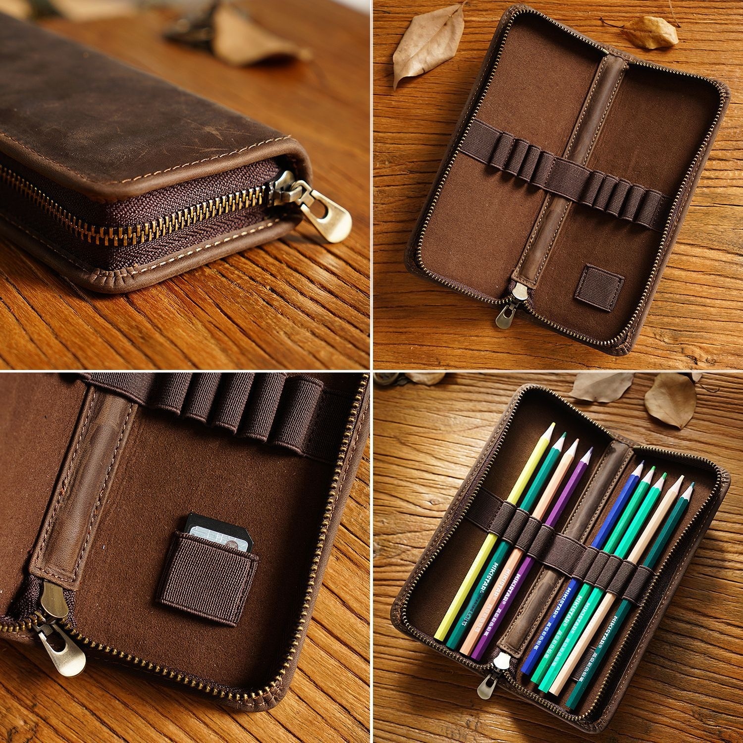 Top Layer Cowhide Pencil Case Retro Crazy Horse Leather Square Zipper Genuine Leather Creative Pencil Case