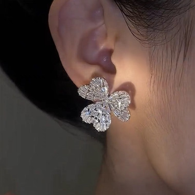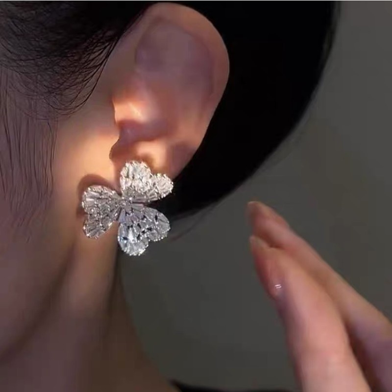 Light Luxury High-end Petal Earrings Temperament Super Shiny Full Diamond Three-leaf Flower Earrings