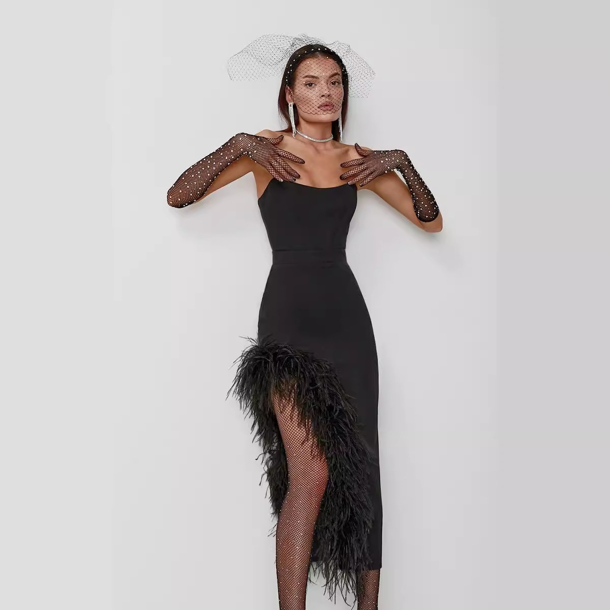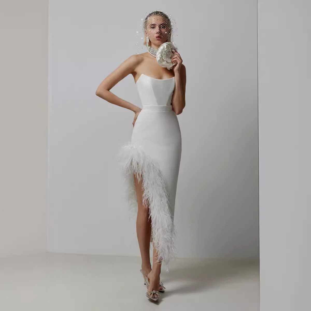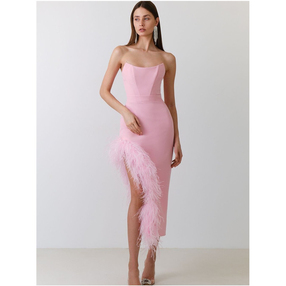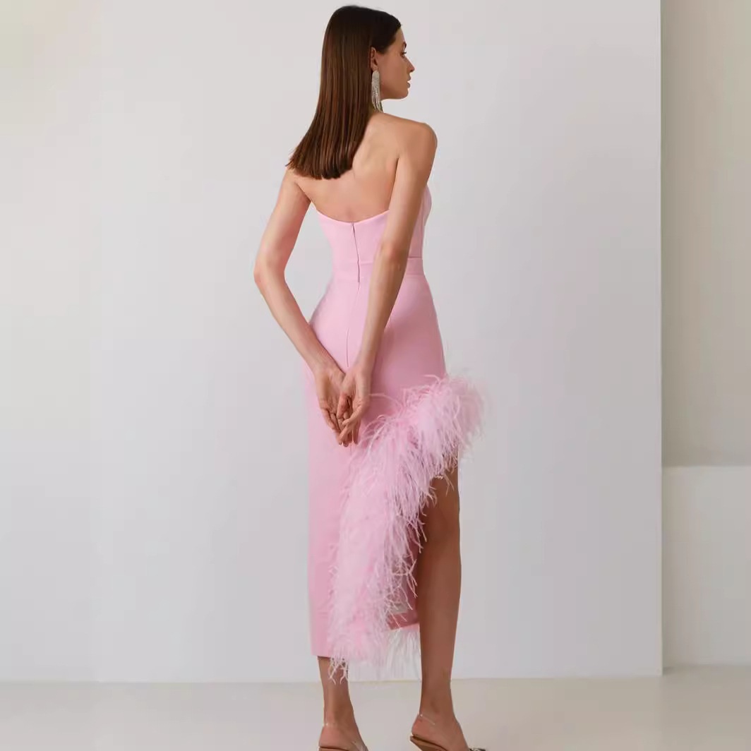 Stylish Pink Bandage Strapless Leg-Revealing Feather Party Dress
