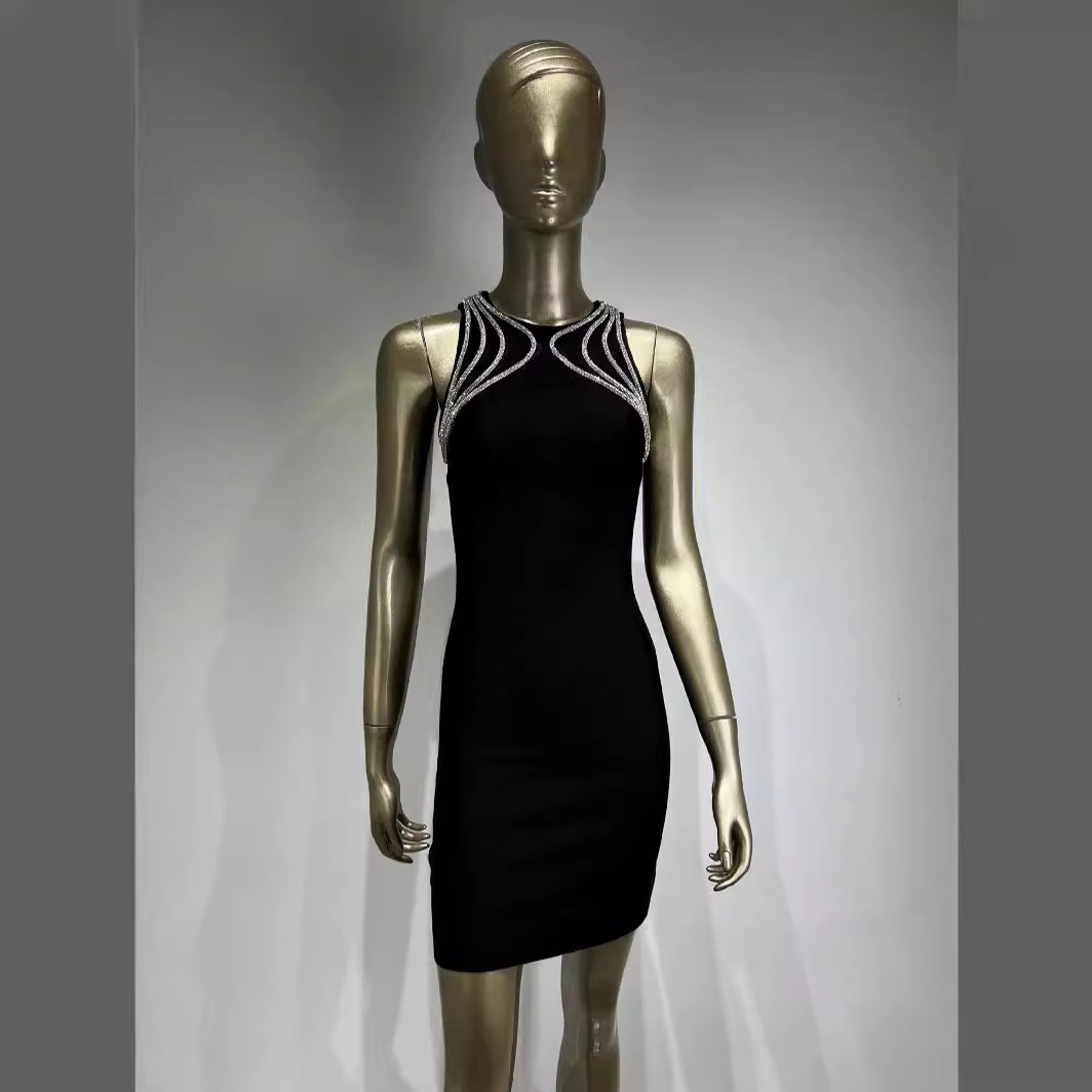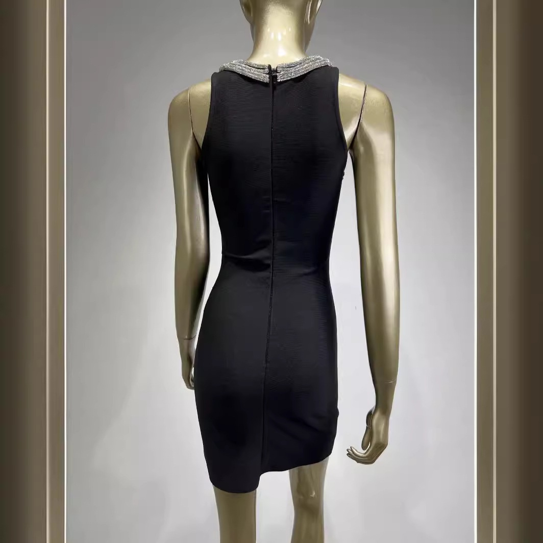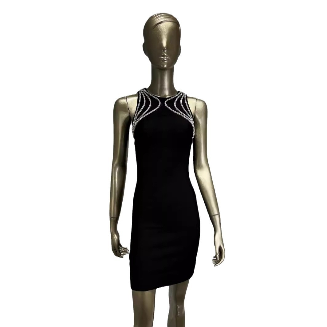 Hot-selling European And American Evening Dress Round Neck Sleeveless Diamond Chain Tight Little Black Dress Celebrity Party Dress