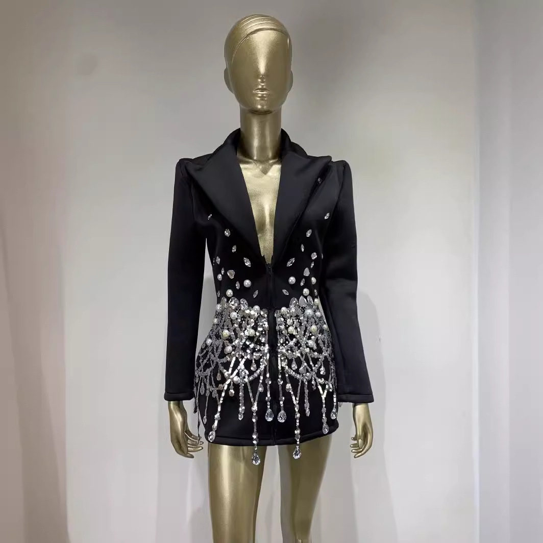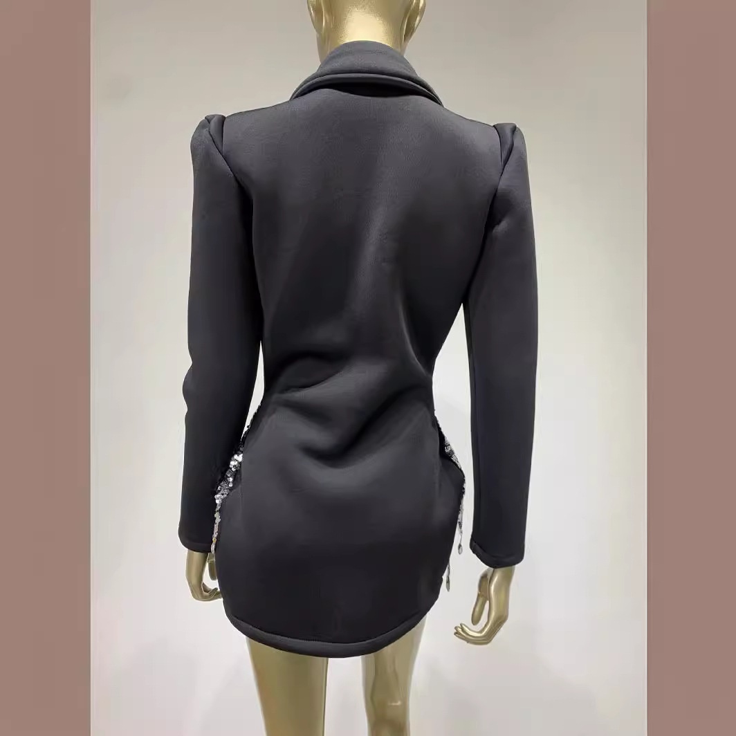 Foreign Trade Products European And American Suit Skirt Party Evening Dress Long-sleeved Rhinestone Sequ Super Short Dress